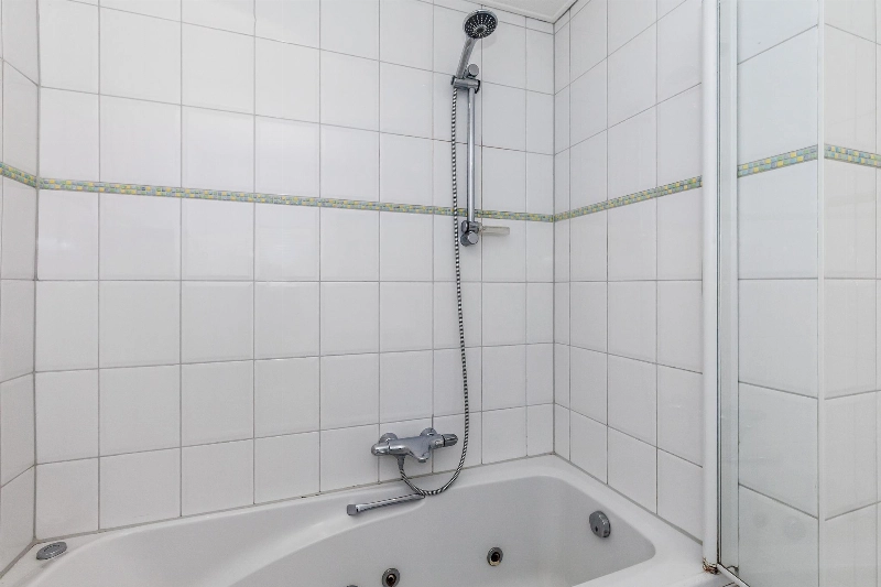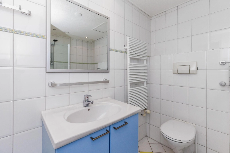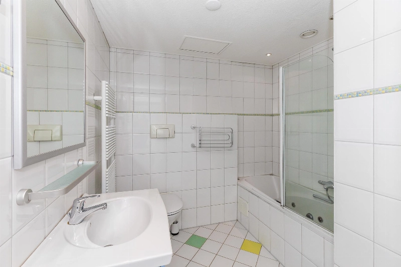 De badkamer is volledig betegeld met witte tegels en voorzien van een ligbad met douchescherm, een zwevend toilet, een wastafelmeubel, een handdoekradiator en een verlaagd plafond met spots.