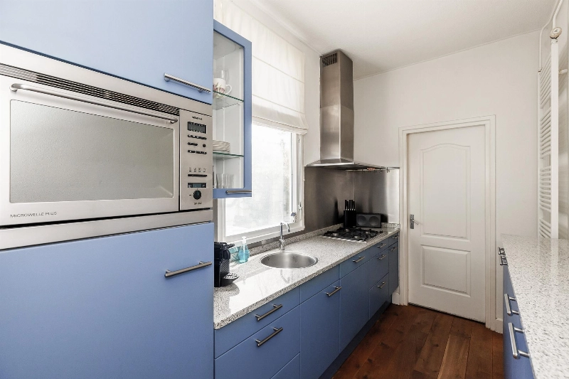 De sfeervolle woonkamer heeft een mooie houten vloer, een gezellige houtkachel, spachtelputz wandafwerking, mooie glas in lood ramen aan de voorzijde en dubbele deuren naar de tuin. Het hoge plafond geeft een aangenaam ruim gevoel. Aan de achterzijde bevindt zich de open moderne keukenopstelling in een blauwtint met een granieten werkblad, een 4 pits gaskookplaat, een RVS afzuigkap, een oven, een koelkast en een vaatwasser. Vanuit de keuken is er toegang tot de bijkeuken met de opstelling van de c.v. combiketel en een deur naar de stenen berging.