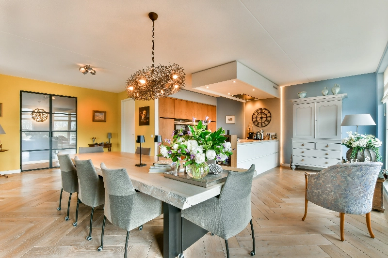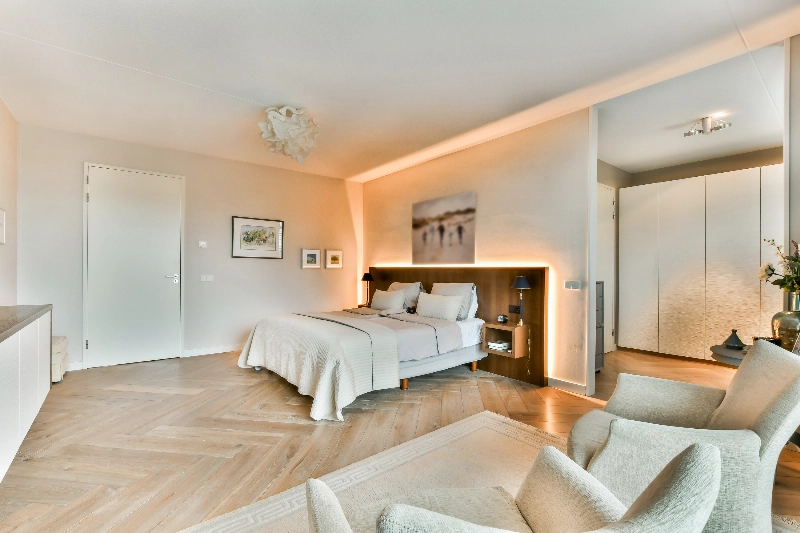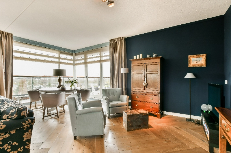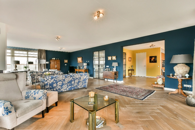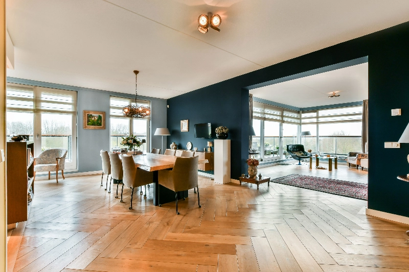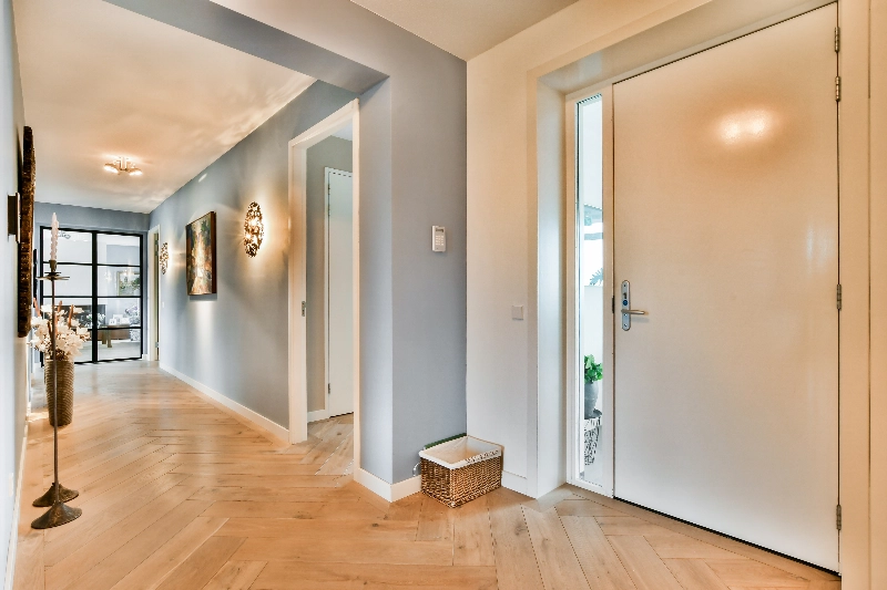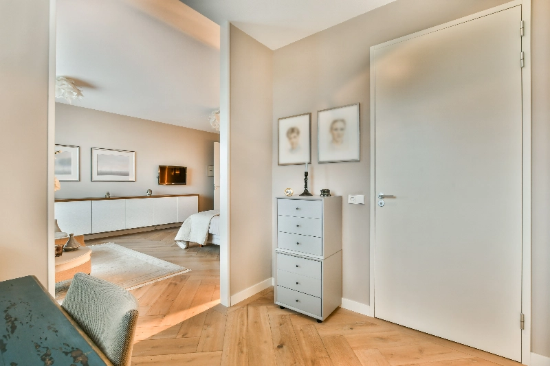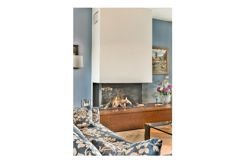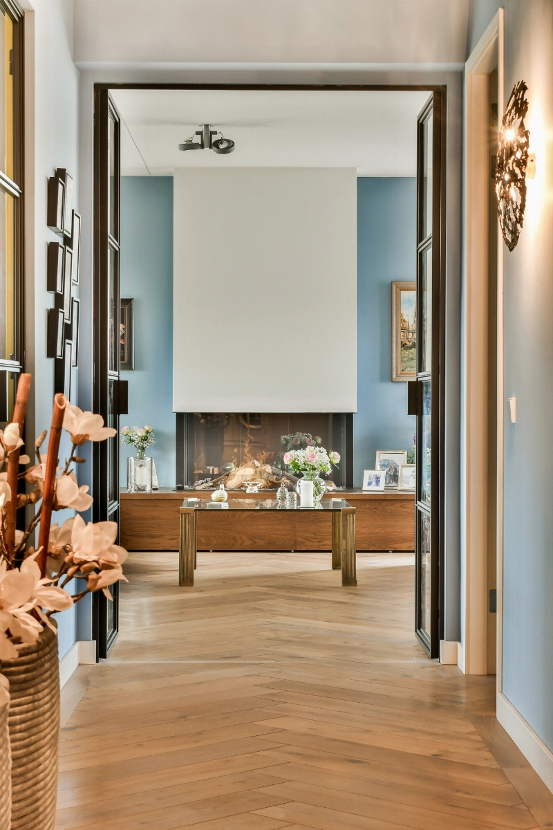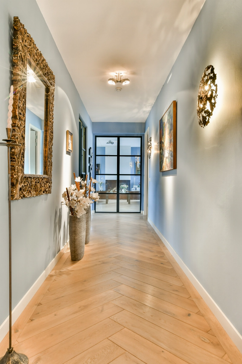Alle wanden zijn strak afgewerkt met glasvlies en door het gehele appartement ligt een eikenhouten vloer die geschikt is voor vloerverwarming- en koeling. De woonkamer en de keuken worden door middel van dubbele openslaande stalen deuren gescheiden van de gang.