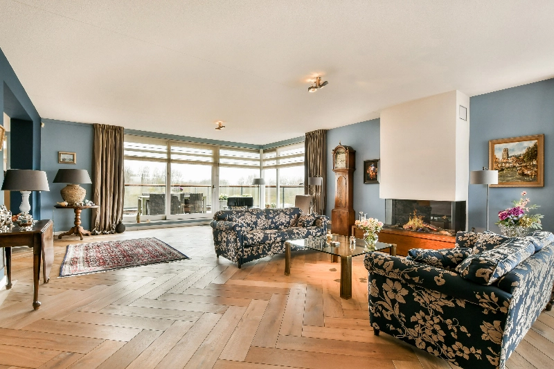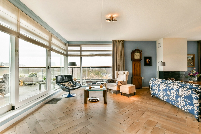 De riante living is maar liefst 65m² en heeft door de vele ramen een prachtig uitzicht en veel lichtinval. Deze kamer heeft genoeg ruimte voor een riante zithoek en de gashaard geeft sfeer en warmte. Via de schuifpui bereikt u het terras.