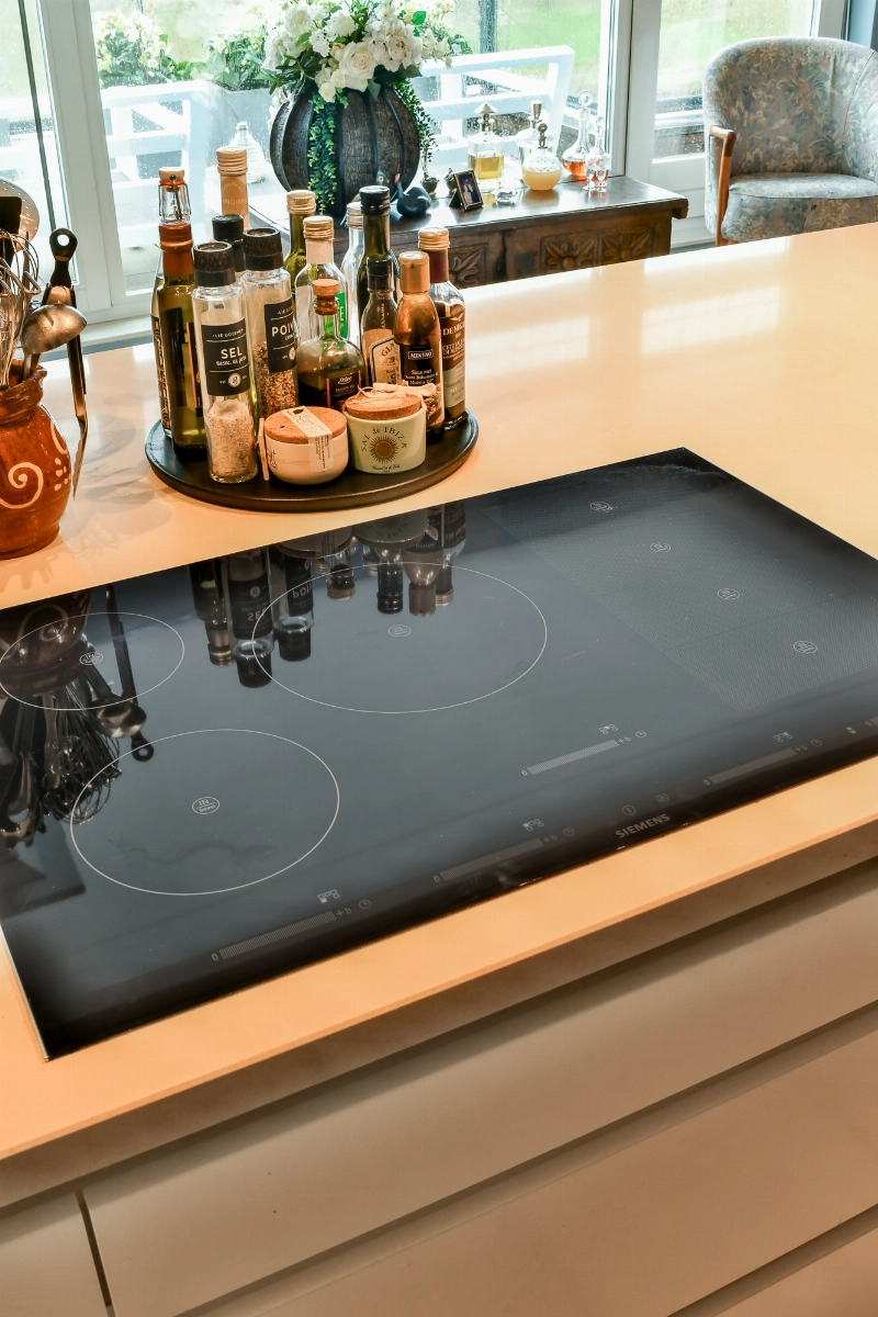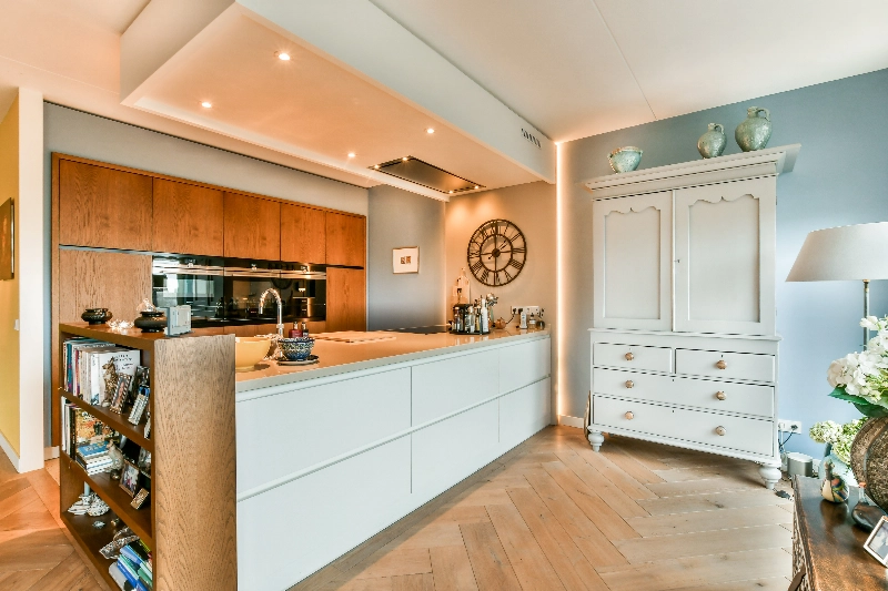 Vanuit de woonkamer is er een doorloop naar de woonkeuken van 46m². De keuken is compleet afgewerkt met een houten hoge kastenwand voorzien van oven, combi-oven, warmhoudlade, koffiemachine, vriezer en koelkast. Het kookeiland is in een lichte kleur afgewerkt en voorzien van een composiet werkblad, vaatwasser, inductiekookplaat, afzuiging en veel bergruimte. Er is een grote voorraadkast aanwezig. Via de keuken bereikt u tevens het dakterras.