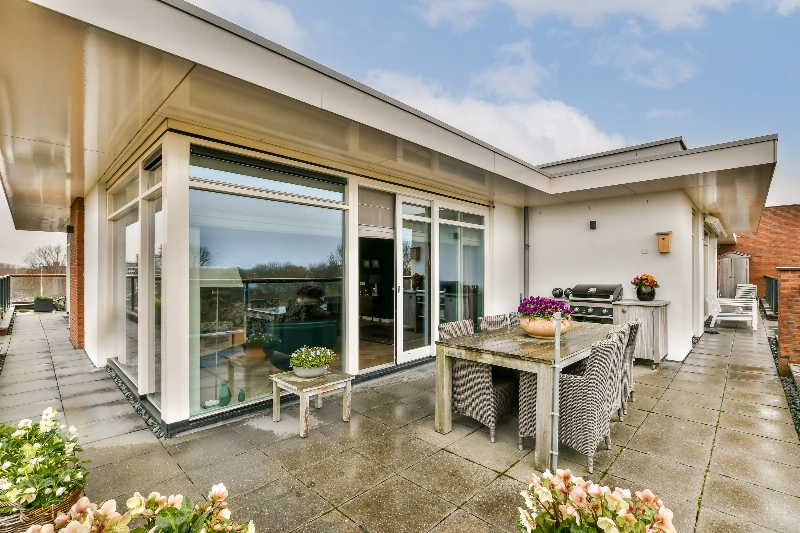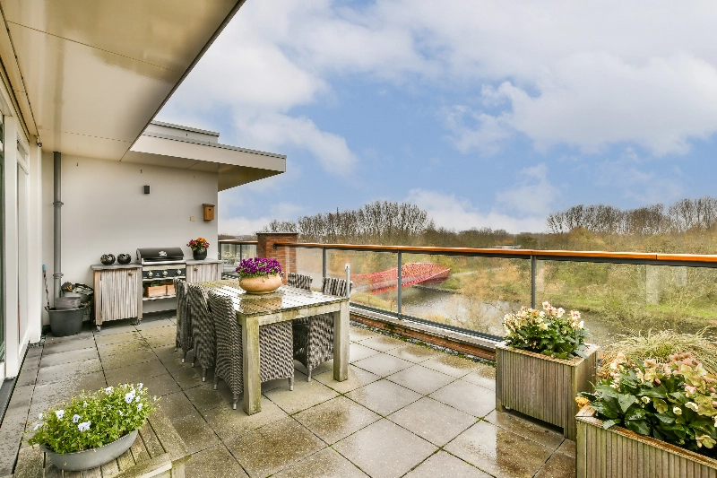 Het dakterras is 99m² en sluit aan op alle woonvertrekken. Op het terras is meer dan genoeg ruimte voor een eettafel en ligstoelen aan weerzijden van het terras. Dankzij de ideale ligging kunt u hier de hele dag genieten van de zon óf schaduwrijke plekken opzoeken.