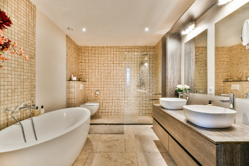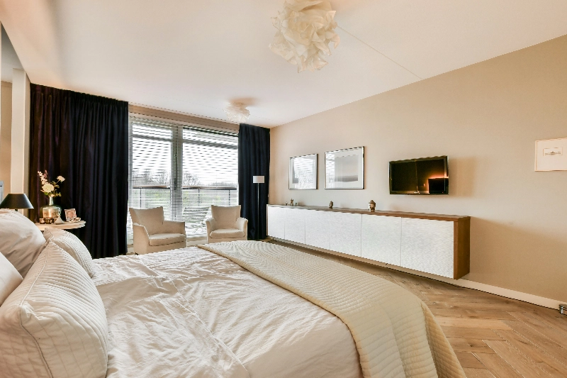 De 3e slaapkamer betreft een royale masterbedroom (25m2) met deur naar het dakterras, een kleedruimte en aansluitend de privébadkamer. Deze badkamer is luxe betegeld en voorzien van een vrijstaand ligbad, een toilet, breed wastafelmeubel met dubbele waskom en een grote inloopdouche.