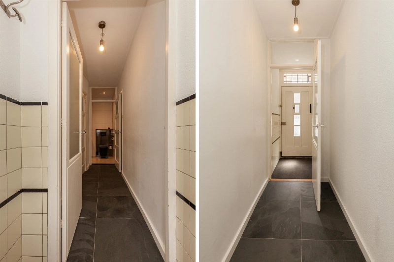 Entree via tochtportaal met de sfeervolle authentieke wandbeteling. De hal is voorzien van een mooie leistenen vloer en een ruime opbergkast met meterkast (6 groepen, dubbele aardlekschakelaar en hoofdschakelaar).