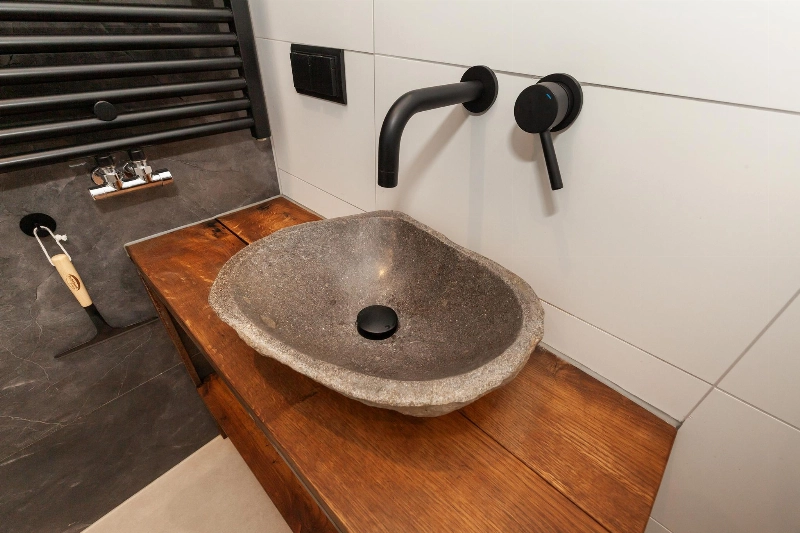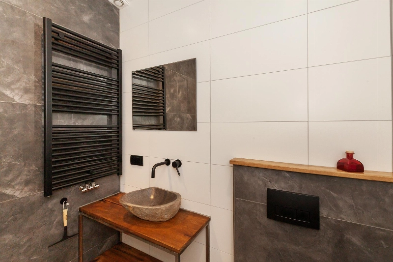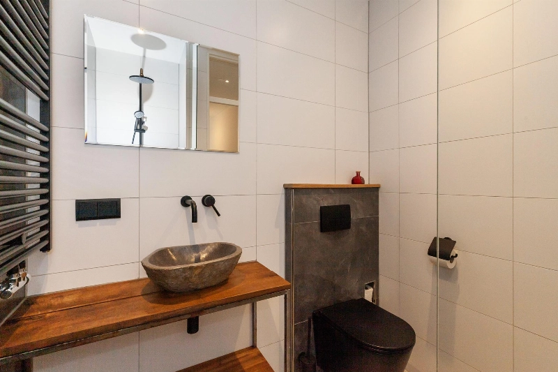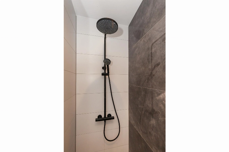 In 2021 is de badkamer volledig gerenoveerd met mooie grijs gemarmerde en witte wandtegels, lichtgrijze vloertegels, een inloopdouche, een stijlvol wastafelmeubel met een waskom en een spiegel, een handdoekradiator en een zwevend toilet.