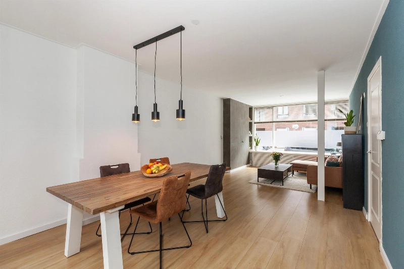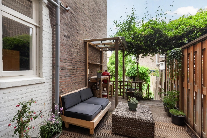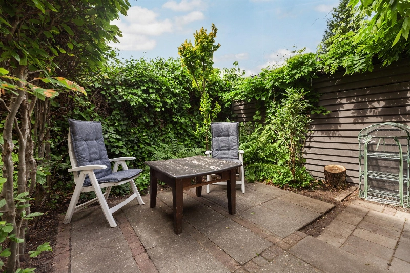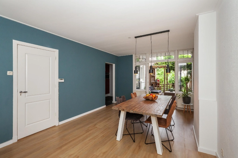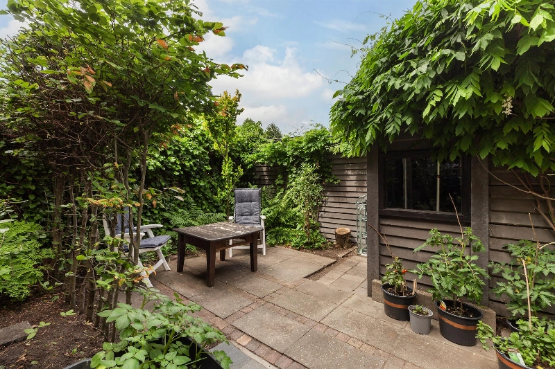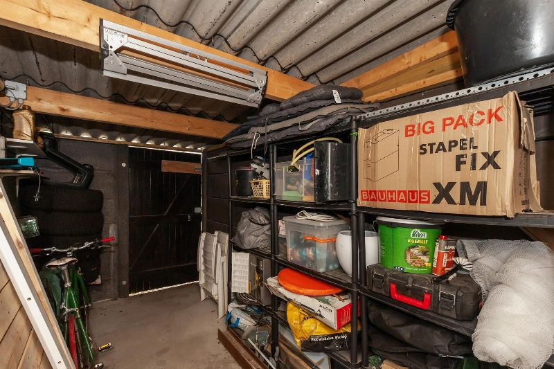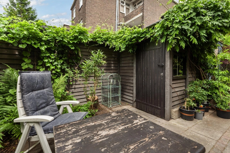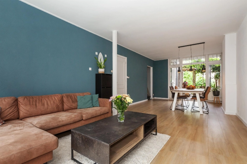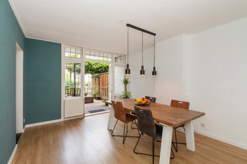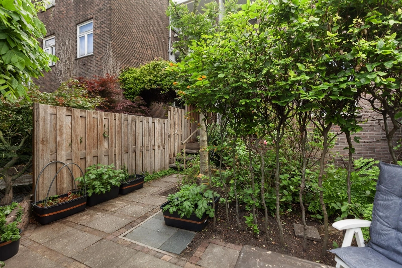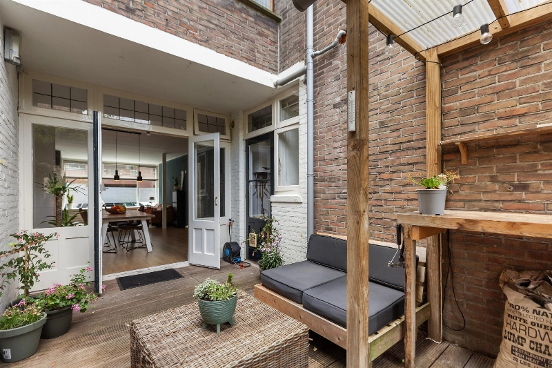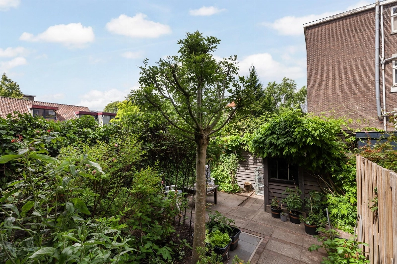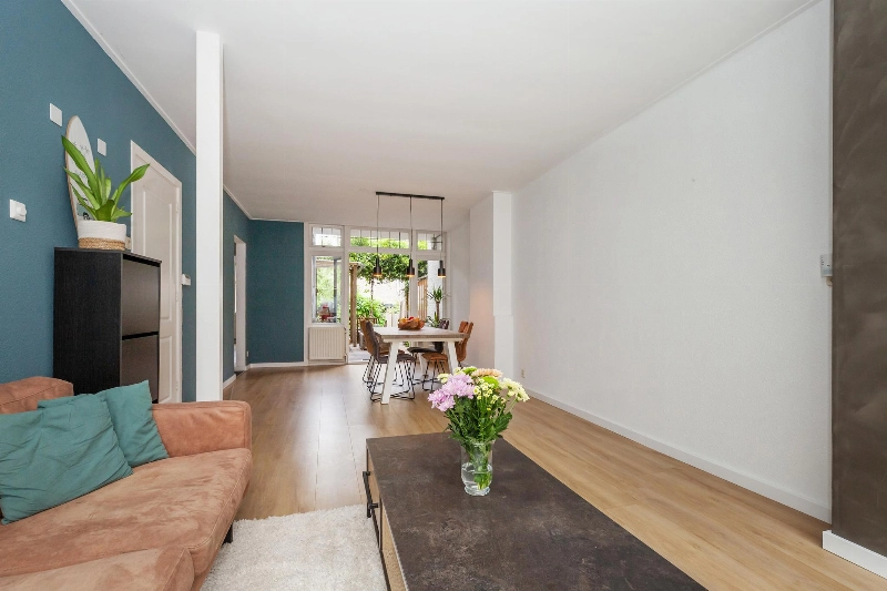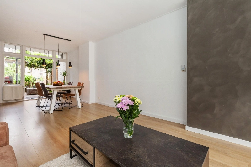 De mooie ruime woonkamer is sfeervol afgewerkt met spachtelputz wanden, een strak gestuct plafond, een licht eikenkleurige laminaatvloer en een radiatorombouw. Via de openslaande deuren met glas in lood betreedt je de sfeervolle tuin. Deze is ingericht met een houten vlonderterras en een kleine overkapping direct aan de woning en een tuin met veel groen in het lager gelegen gedeelte. Achterin bevindt zich een berging met elektra en achterom- ideaal voor fietsen of tuingereedschap.