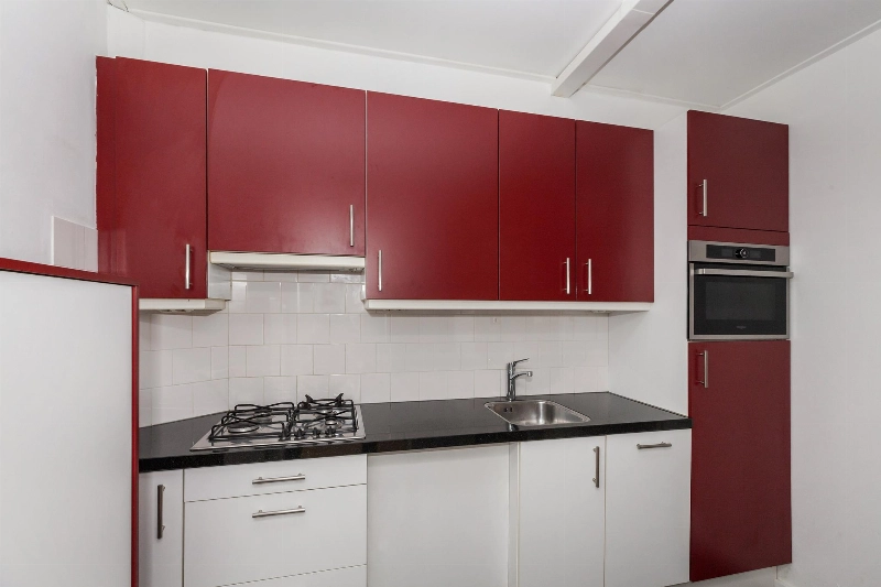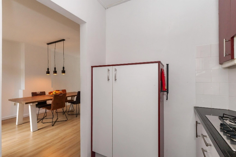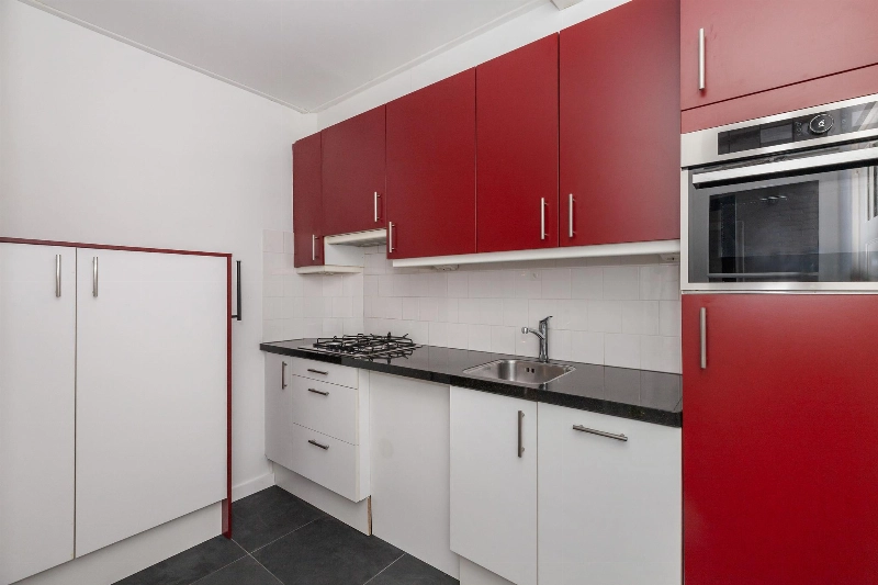 De moderne keuken is uitgevoerd in het wit met bordeaux rood en is compleet uitgerust met een 4 pits gaskookplaat met vlakscherm afzuigkap, een vaatwasser, een combimagnetron, een koelkast en een wasmachine aansluiting. Op de vloer ligt ook hier een mooie leistenen vloer. Naast de deur naar de tuin bevindt zich de opstelling van de c.v. combiketel (Remeha 2022)