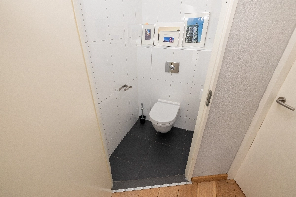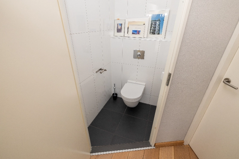 De ruime voortuin biedt veel privacy dankzij de fraaie bolcatalpa’s. Entree, hal met moderne toiletruimte voorzien van witte wandbetegeling, zwarte vloertegels, een zwevend toilet en een fonteintje.