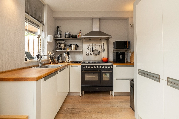 Aan de achterzijde van de woning bevindt zich de ruim opgestelde keuken in U-vorm. De keuken is uitgevoerd in het hoogglans wit met een stijlvol houten werkblad. De keuken is uitgerust met een groot fornuis (ter overname) met een RVS afzuigkap en een vaatwasser. In het hoge kastengedeelte bevinden zich een koelkast, vriezer en een apothekerskast.