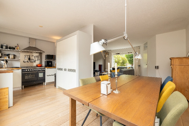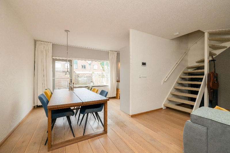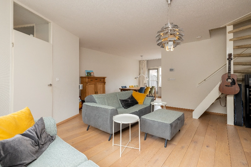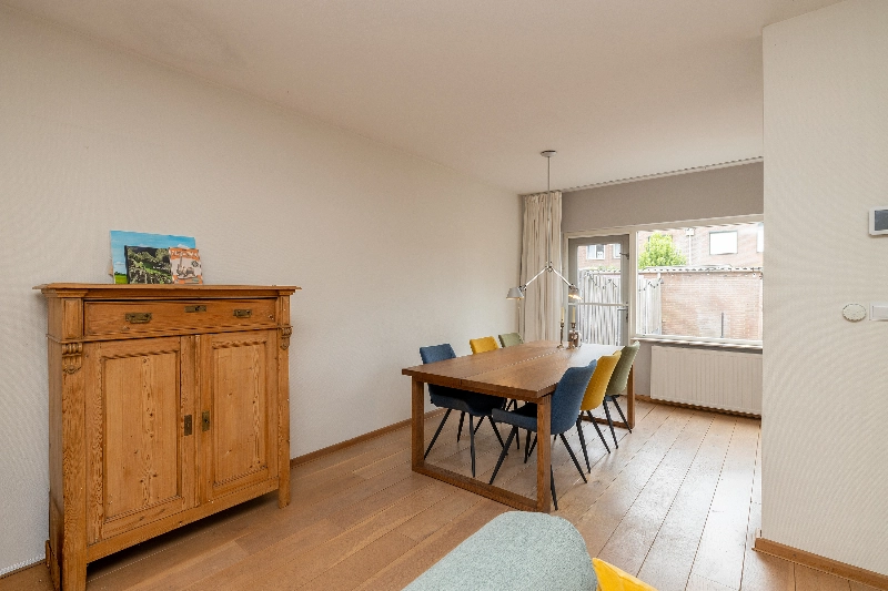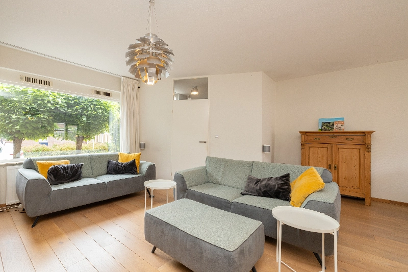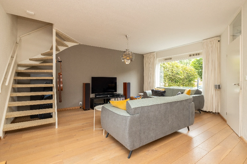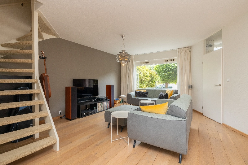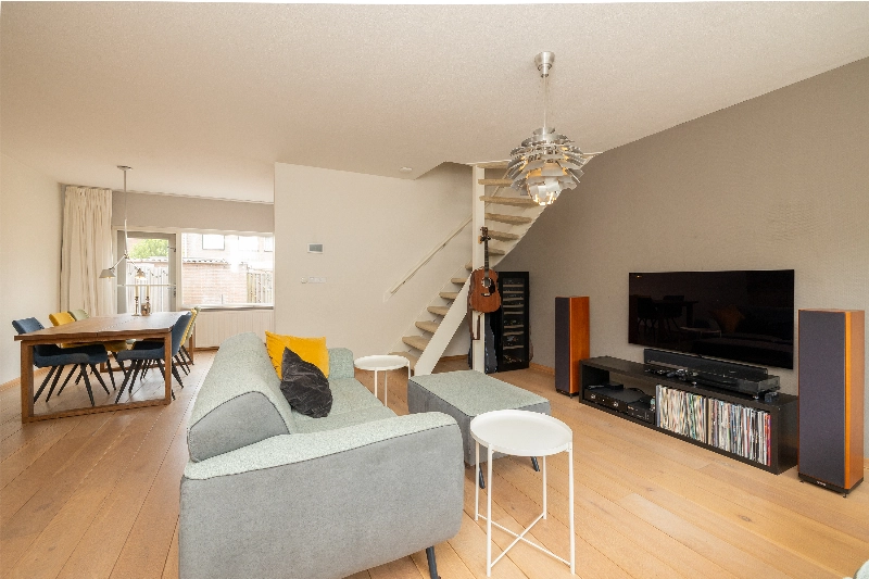 De gezellige woonkamer is gesitueerd aan de voorzijde van de woning en biedt dankzij de grote raampartijen veel natuurlijk licht. De vloer is afgewerkt met een fraaie Amerikaans eiken vloer die naadloos doorloopt naar de keuken. Alle wanden zijn voorzien van glasvliesbehang.