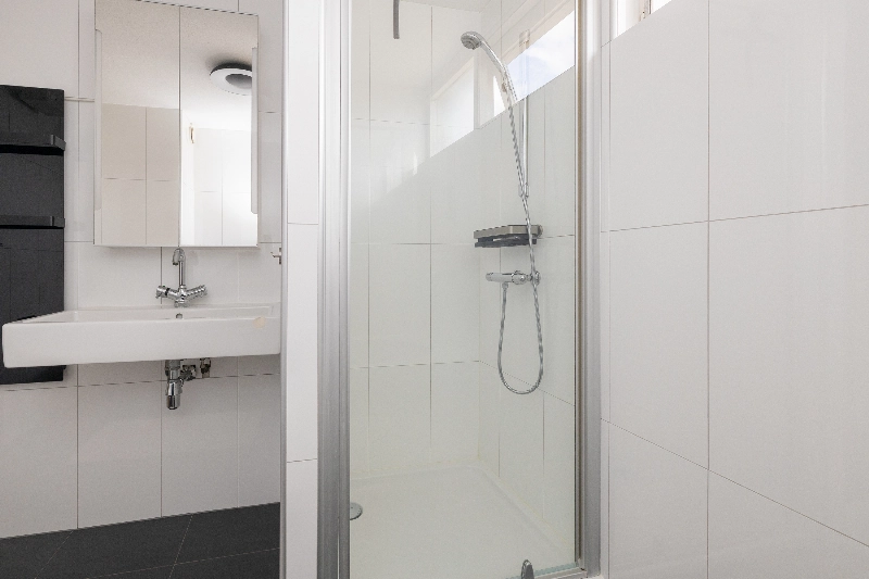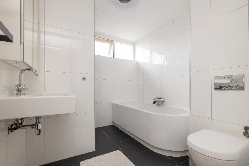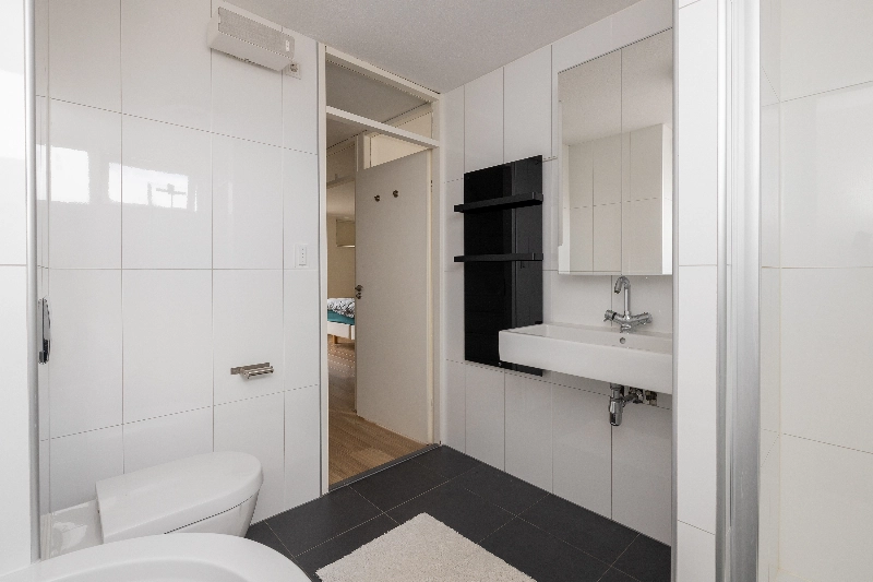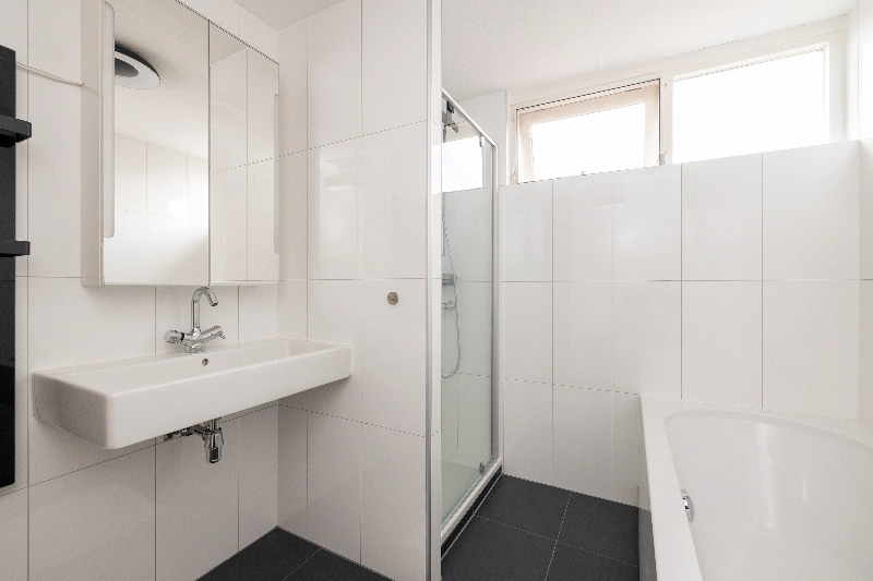De moderne badkamer is smaakvol uitgevoerd met grote witte wandtegels, zwarte vloertegels, een ligbad, een ruime douchehoek met glazen deur, een infraroodpaneel, een wastafel met een spiegelkast, een handdoekradiator en een zwevend toilet. De vloer is voorzien van vloerverwarming.