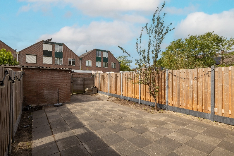 Via de keuken bereik je de zonnige achtertuin, gelegen op het westen. Hier geniet u de hele middag en avond van de zon. De tuin beschikt over een stenen berging en achterom.