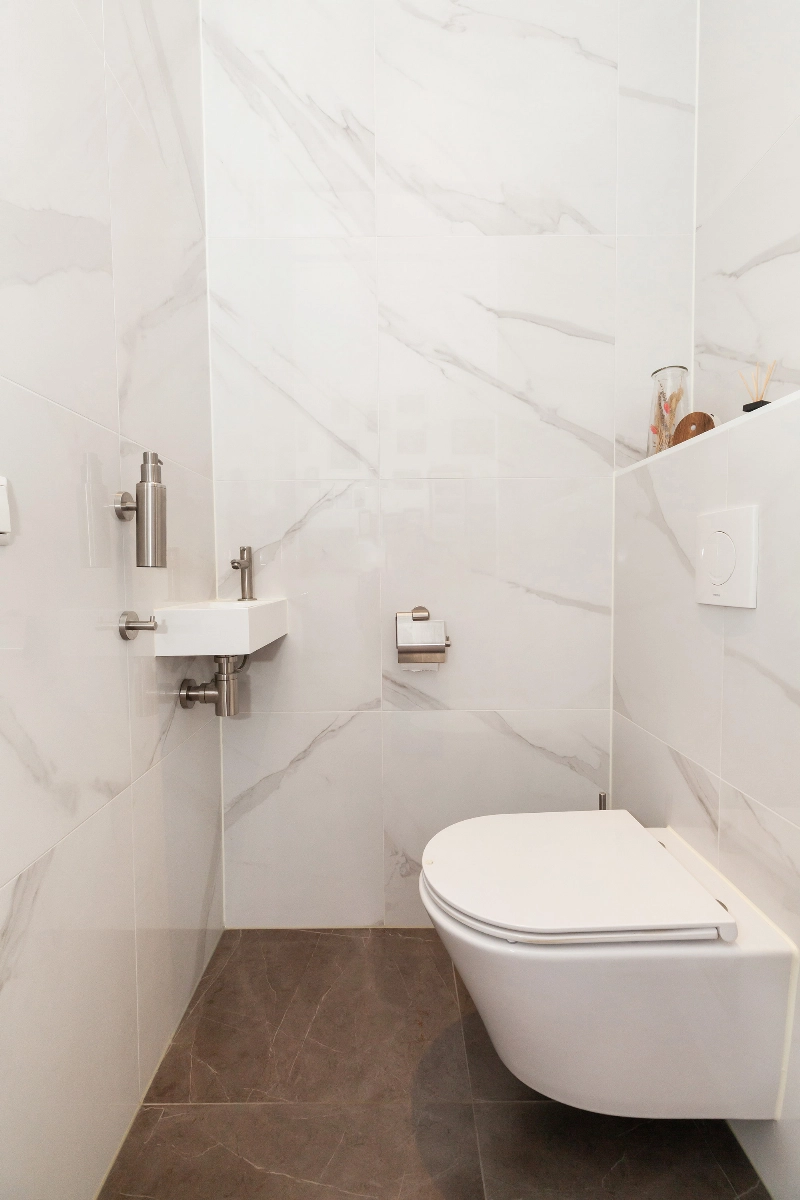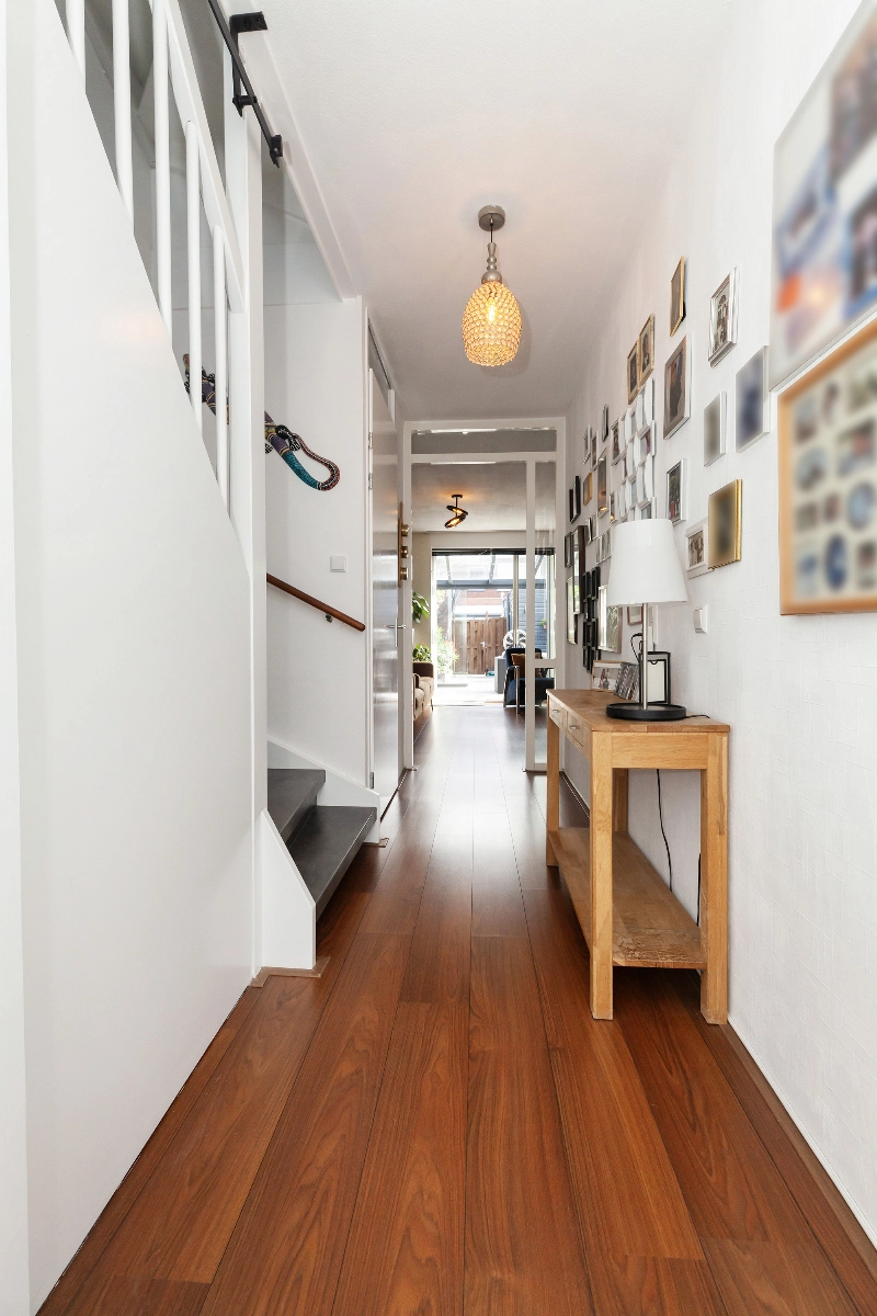 Via de verzorgde voortuin bereik je de voordeur. Eenmaal binnen sta je in de ruime gang met meterkast en een in 2021 vernieuwd toilet met geheel marmerlook betegeling, zwevend closet en een fontein. Een schuifdeur onder de trap zorgt voor handige bergruimte voor de jassen en schoenen, zo blijft de hal altijd netjes!