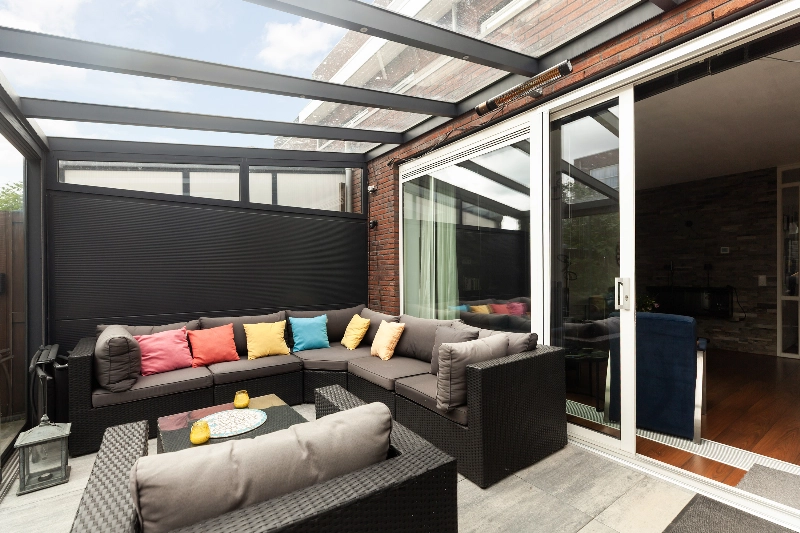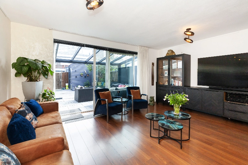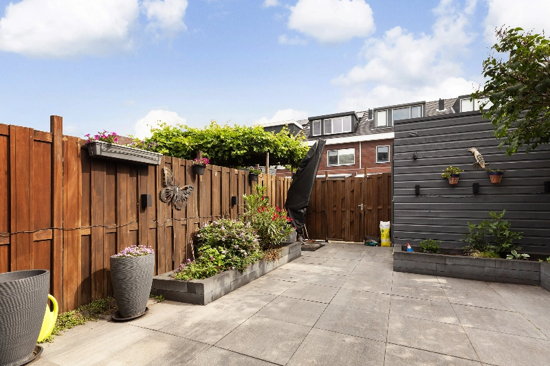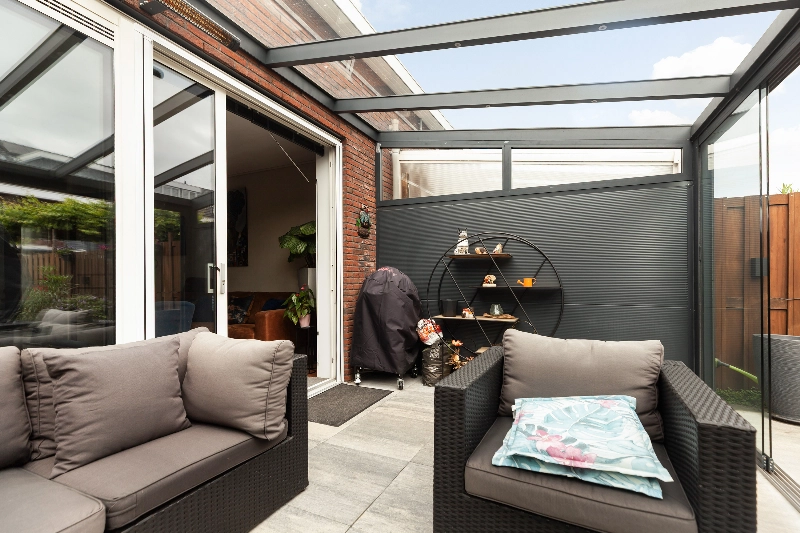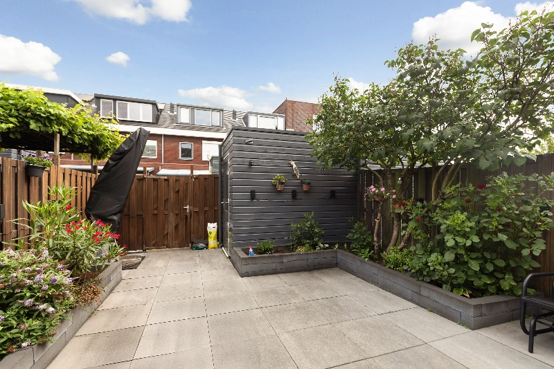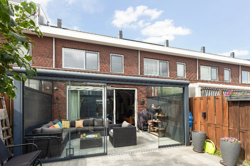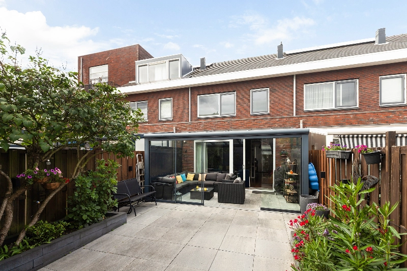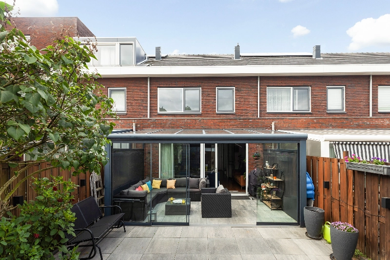 We gaan via de schuifpui naar buiten. Wow.....! Zo sta je in de prachtige serre met glazen schuifdeuren. Aan de gevel hangt een terrasverwarmer zodat je hier het hele jaar door kunt genieten. Tijdens de warme dagen schuif je alles lekker open en geeft het sfeer aan het geheel! En nog blijft er genoeg buitenruimte over. De tuin is modern betegeld en voorzien van groenborders, een houten berging en deur naar achterom.