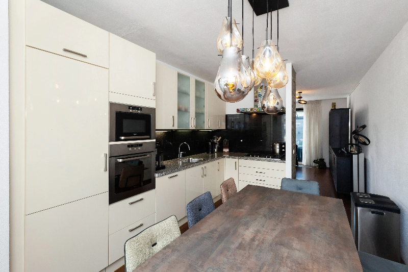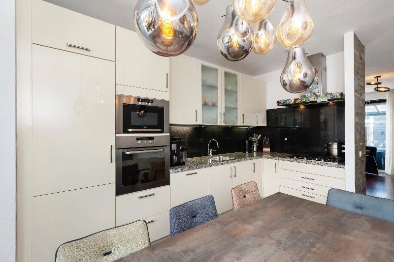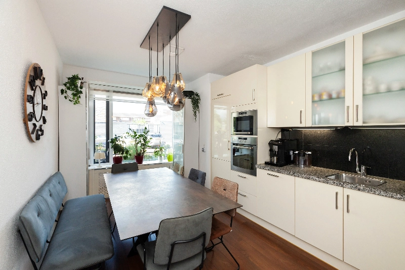 We lopen door via de staallook tussendeur naar de woonkamer. Dit is een fijne kamer met voldoende ruimte voor alle meubilair. Er is een schuifpui met plisséhor naar de tuin en op de vloer ligt een laminaatvloer. Aan de voorzijde ligt de woonkeuken. Deze is voorzien van een crèmekleurige hoekopstelling met een hardstenen aanrechtblad en achterwandbetegeling. Verder is alle apparatuur aanwezig, denk daarbij aan koelkast, vriezer, oven, magnetron, afzuigkap en de vaatwasser en 5 pits gaskookplaat zijn in 2023 vernieuwd. De keuken geeft plek aan de eettafel.