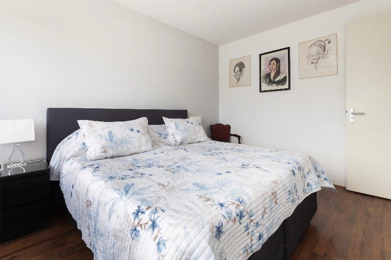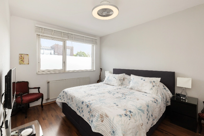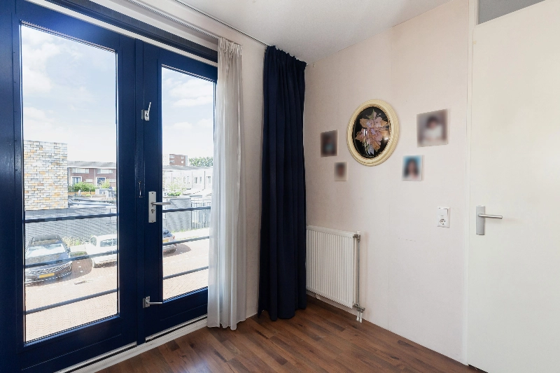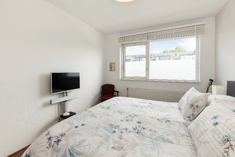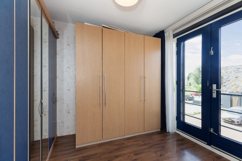 Slaapkamer I is gelegen aan de voorzijde en is voorzien van aan frans balkon met een plisséhor op de dubbele deur. de twee kledingkasten blijven achter in de woning.