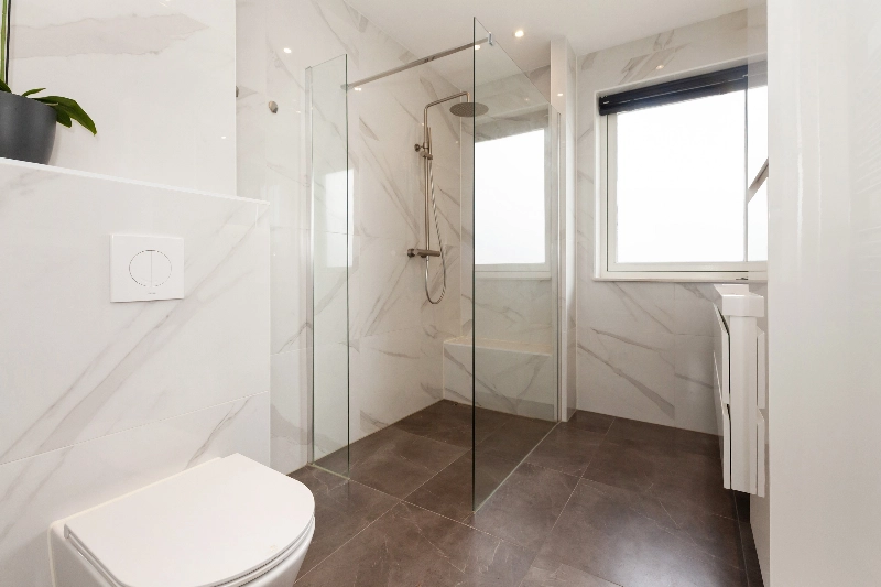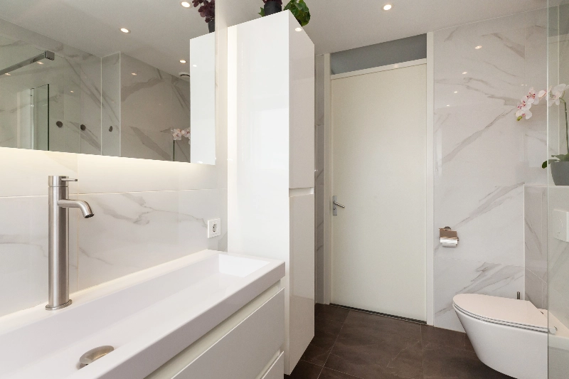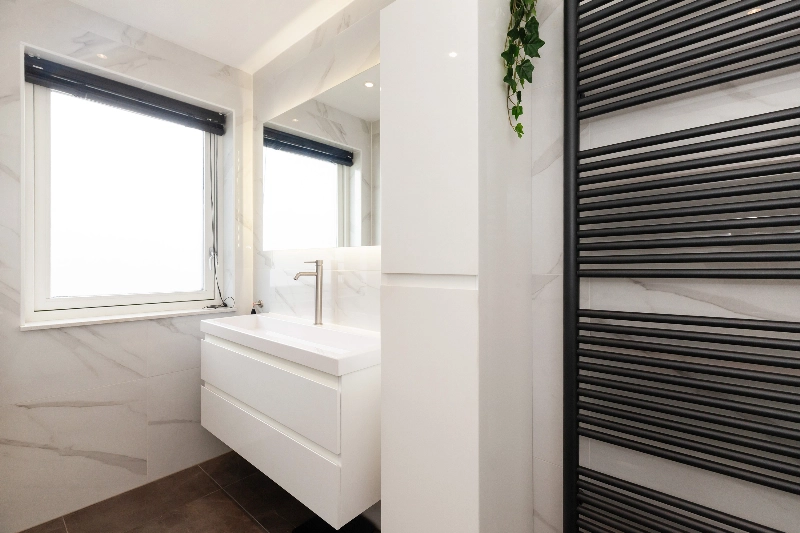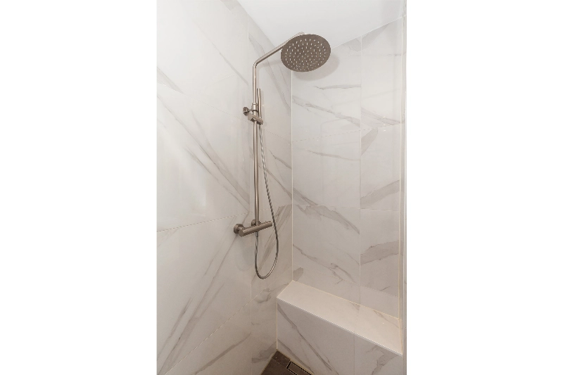De marmerlook betegeling op de wanden, samen met de donkergrijze vloertegels maken een mooi geheel. Verder vind je hier een wit wastafelmeubel met mengkraan en daarboven een verlichte spiegel, een hoge kast, 2e toilet, radiator en een grote inloopdouche.
