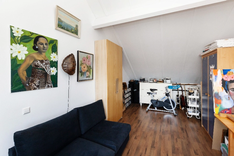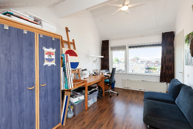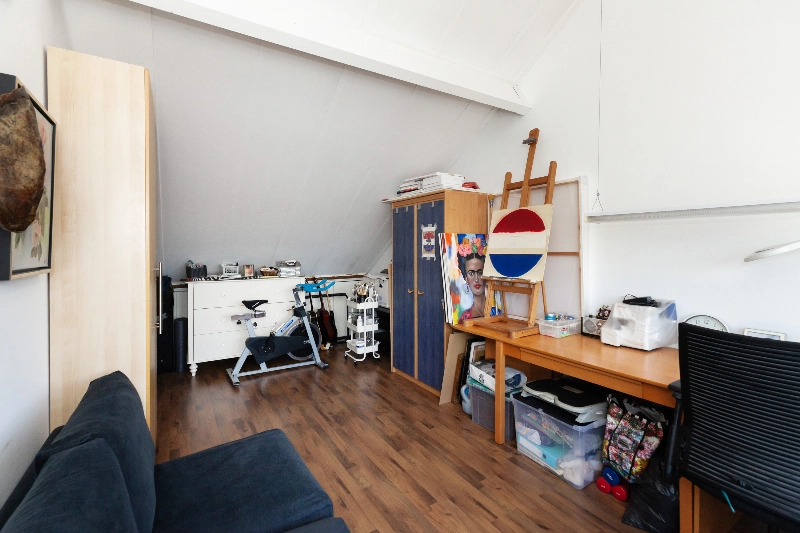 De zolderkamer is een prachtige ruimte met veel daglicht. Met het plaatsen van een dakkapel aan de achterzijde kan je hier eenvoudig twee prima kamers van maken. Ook deze kamer is voorzien van laminaat.