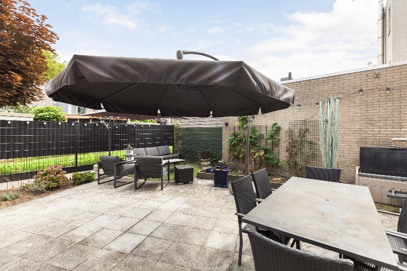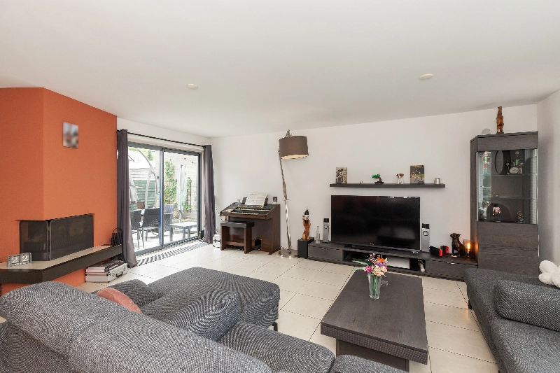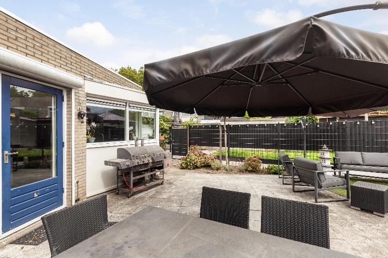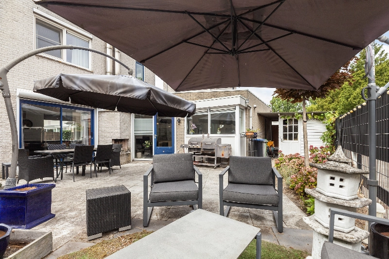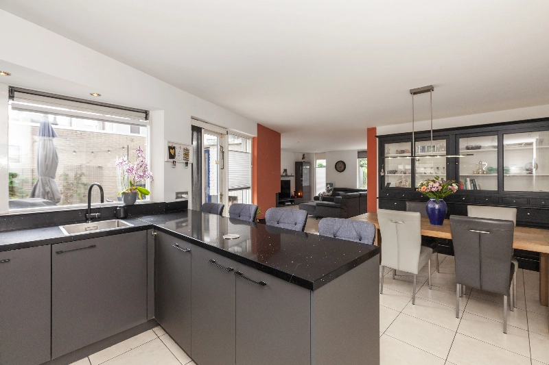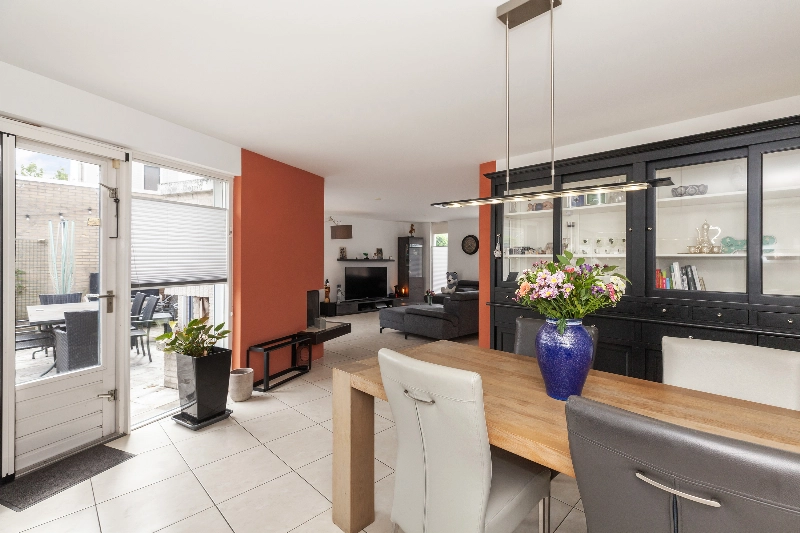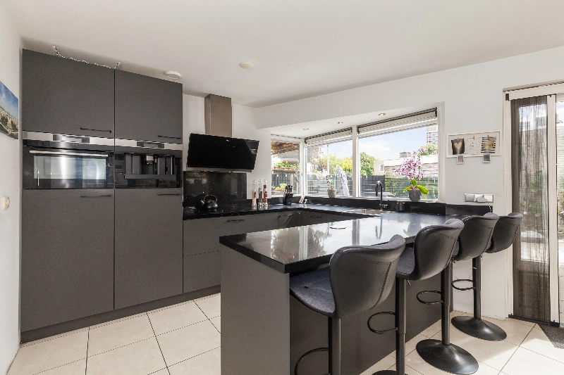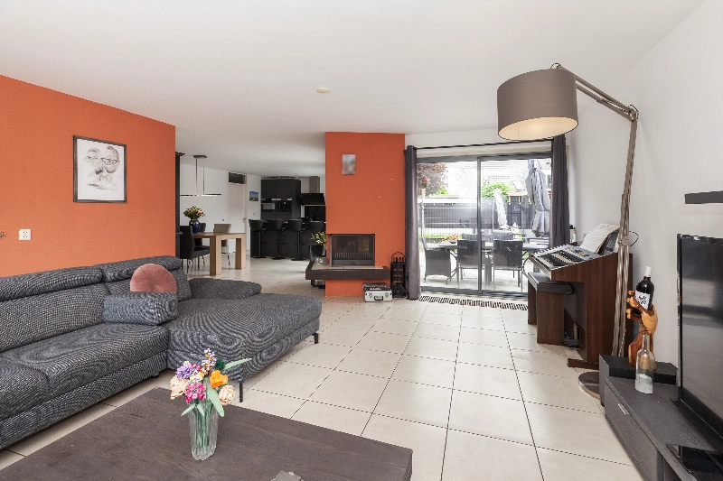 De gezellige woonkamer is afgewerkt met een plavuizen vloer voorzien van comfortabele vloerverwarming. De sfeervolle open haard zorgt voor knusse avonden in de winter, terwijl de grote aluminium schuifpui op zonnige dagen de tuin volledig bij de leefruimte betrekt. De tuin is gunstig gelegen op het zuiden en fraai aangelegd met bestrating, een houten berging, een handige overkapping voor de fietsen en een vaste buitenhaard. Dankzij de doorgang aan zowel de voor- als achterzijde is de tuin ook nog eens praktisch in gebruik.