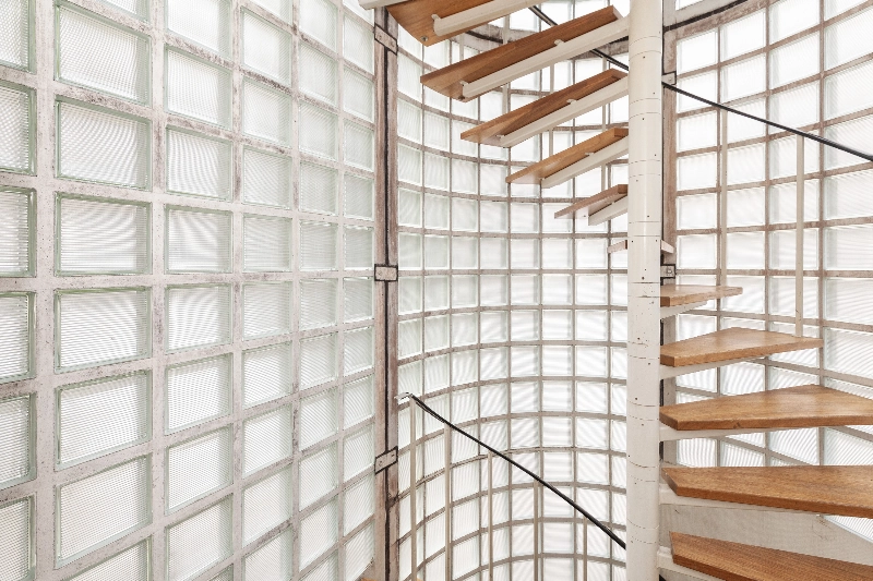 Sfeervolle overloop door het glazen trappenhuis. Deze gehele verdieping is voorzien van een mooie laminaatvloer in de kleur grijs eiken.