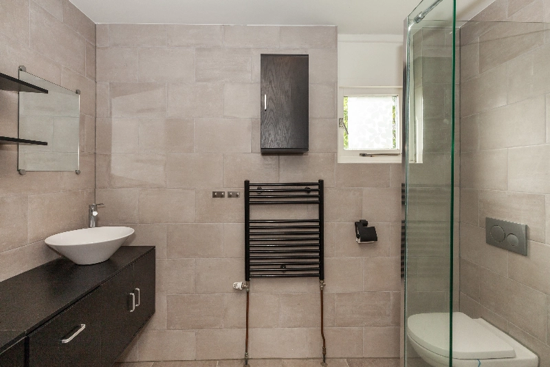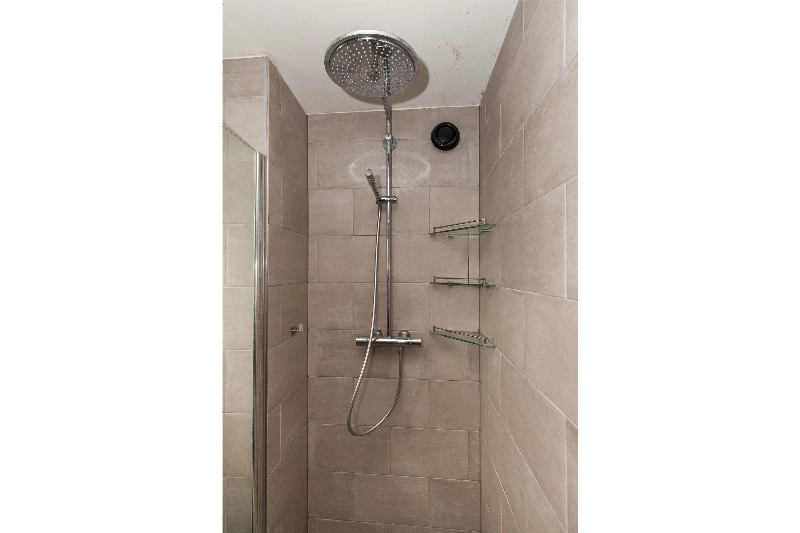 De moderne badkamer is 7 jaar geleden compleet verbouwd en werkelijk een plaatje geworden! Het is betegeld met luxe warmgrijze tegels, een ruime douchehoek met een glazen wand en een regendouche, een moderne wastafelmeubel met dubbele waskom, een handdoekradiator en een zwevend toilet.