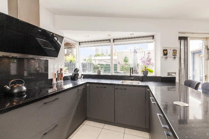 De begane grond heeft een riante woonkamer met een open mat zwarte keuken voorzien van een composiet aanrechtblad en luxe inbouwapparatuur. De garage is omgebouwd tot een kamer waardoor de ideale thuis werkplek is ontstaan. Om van het buitenleven te genieten is er een fijne zonnige tuin op het zuiden.