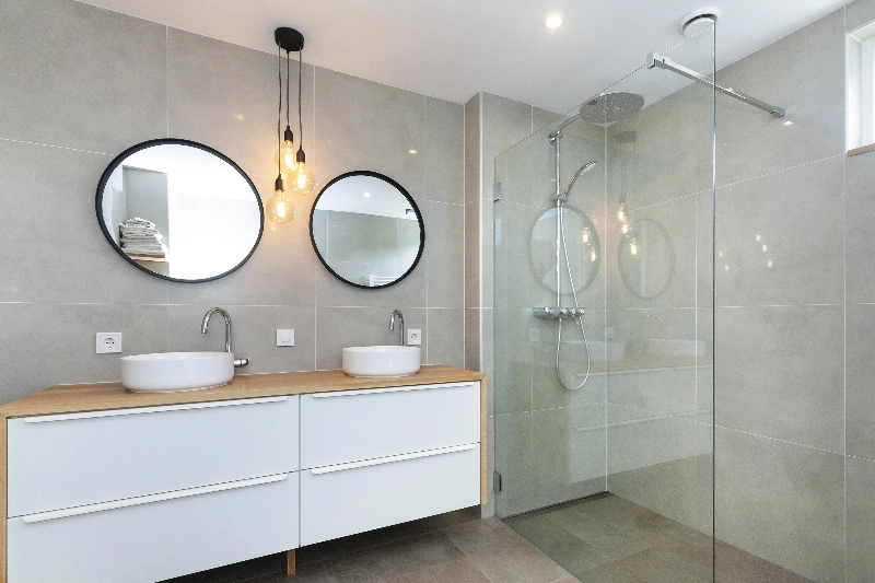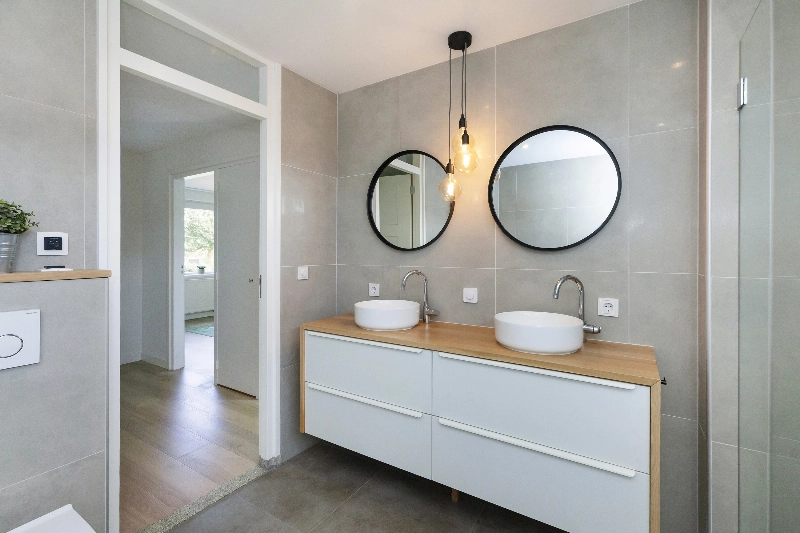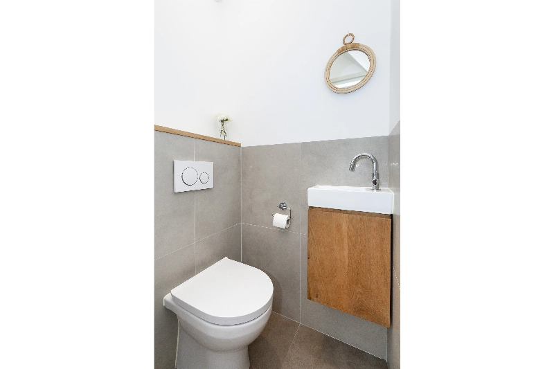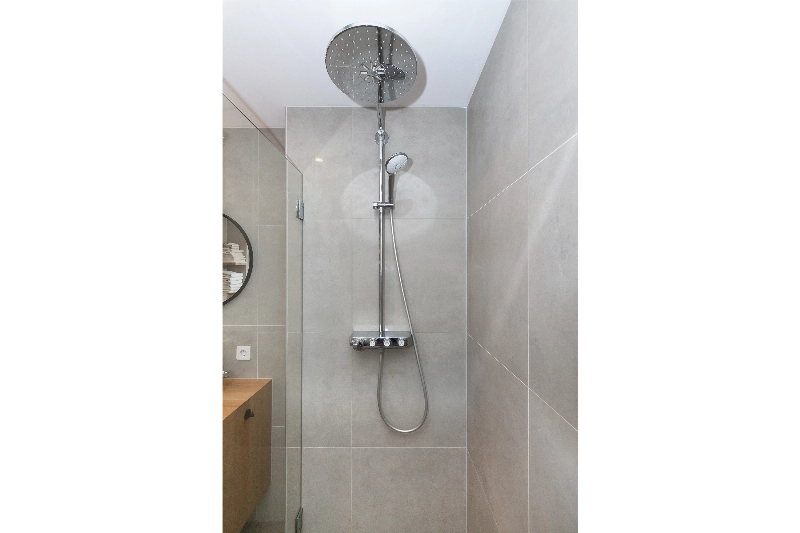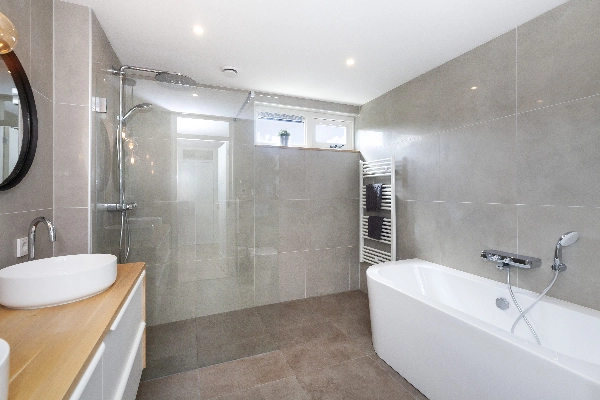 De ruime badkamer is vernieuwd in 2019 en geheel voorzien van tegels in moderne grijze taupetinten. Dankzij het bijtrekken van het voormalig balkon is er veel extra ruimte ontstaan. Voorzien van een grote inloopdouche, ligbad, dubbele wastafel, handdoekradiator, zwevend toilet én vloerverwarming.