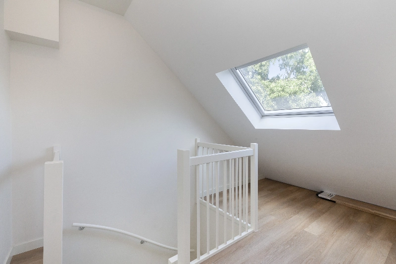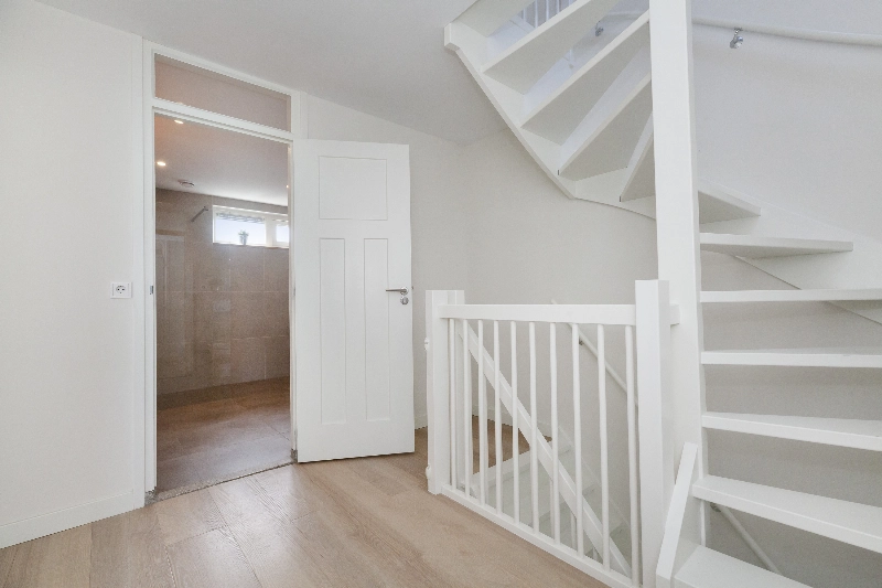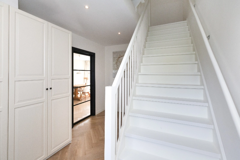 Via de brede trap bereik je de overloop op de eerste verdieping. Hier vind je strakke paneeldeuren, mooie wand- en plafond afwerking en de gehele verdieping is uitgevoerd met een eikenlook pvc-vloer.
