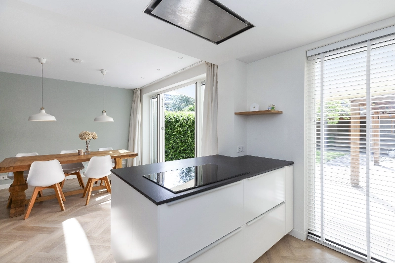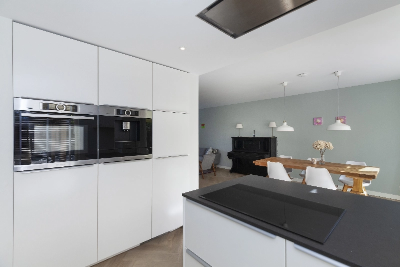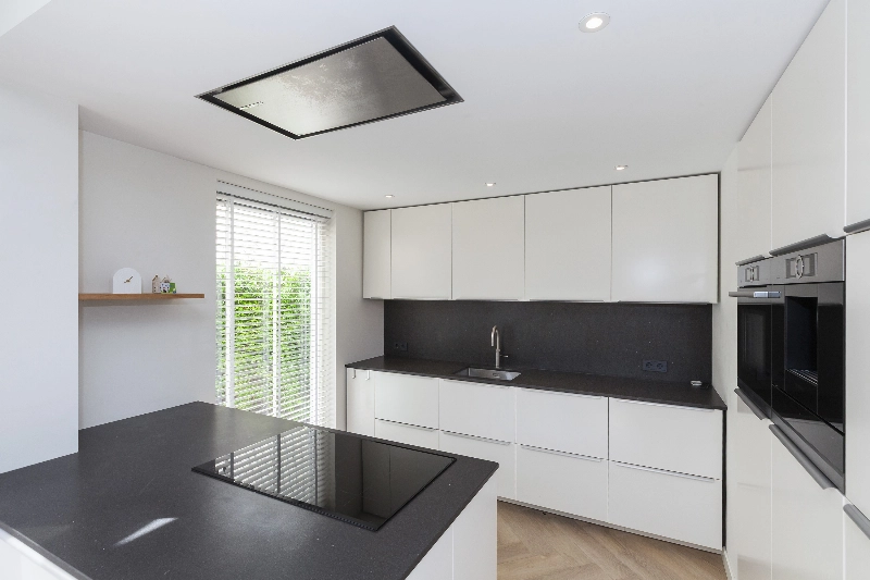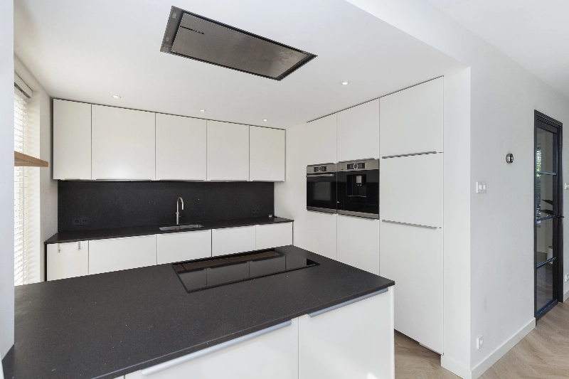 Een stijlvolle glazen deur leidt naar de ruime, lichte woonkamer met nieuwe PVC-visgraatvloer, vloerverwarming en veel lichtinval. Achterin bevindt zich de open keuken met hoge- en lage opstelling en een schiereiland uit 2019. Alle denkbare inbouwapparatuur is aanwezig zoals combi-oven, ingebouwd koffieapparaat, inductiekookplaat, plafondafzuiging, koelkast, vriezer, Quooker en warmhoudlade.