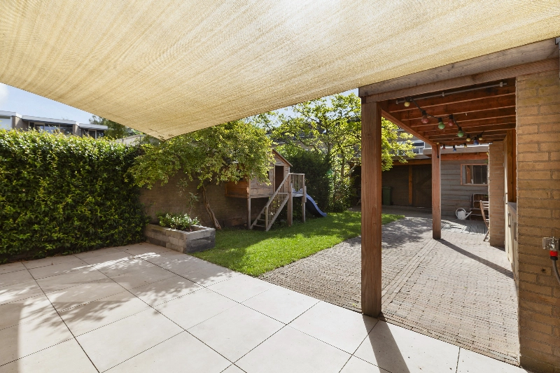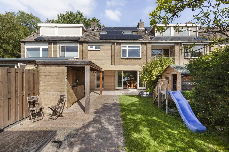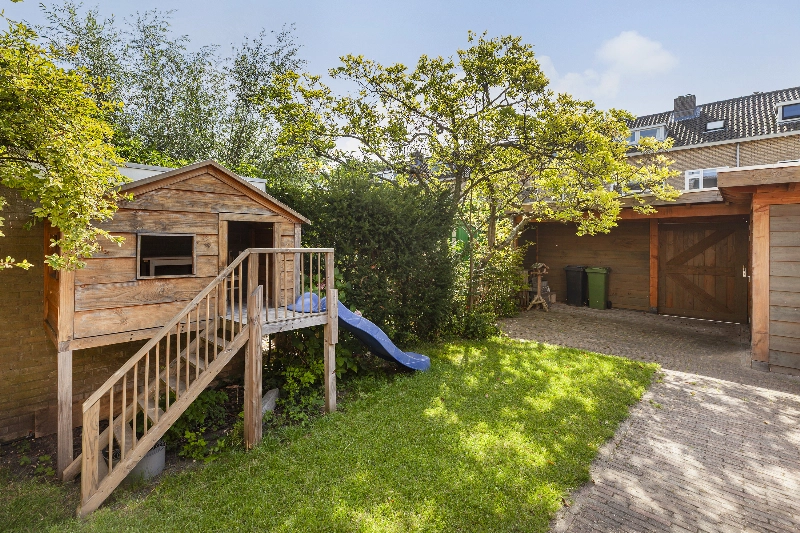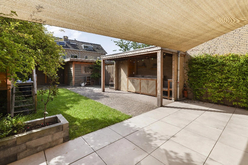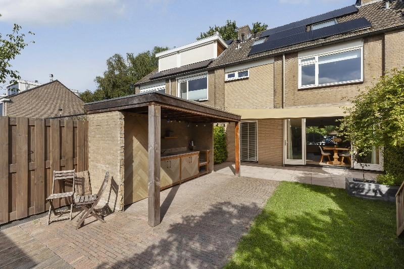 De dubbele deuren met plisséhor geven toegang tot de zonnige, keurig aangelegde tuin op het zuiden. Deze beschikt over een sfeervolle overkapte buitenkeuken, houten berging, wateraansluiting, een speelhuisje (blijft achter) én een schuifdeur naar de achterom.