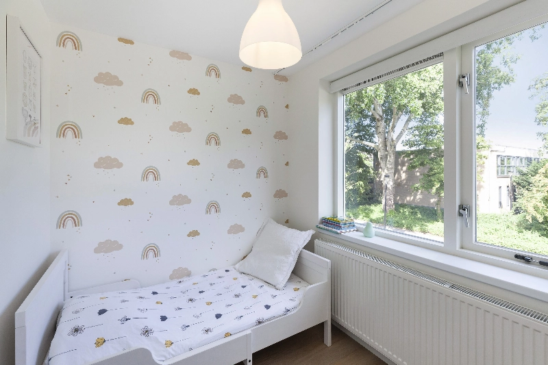 Aan de voorzijde liggen nog twee kamers. De eerste biedt een leuk uitzicht op het groen en het water, en is net als de rest netjes afgewerkt. De tweede kamer is iets compacter en perfect in te richten als kinderkamer of thuiswerkplek.
