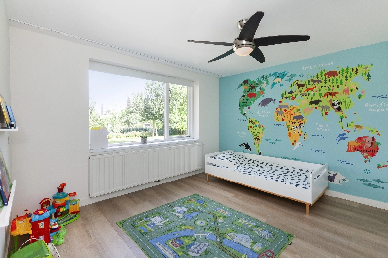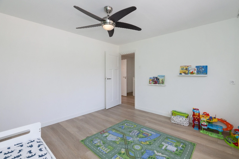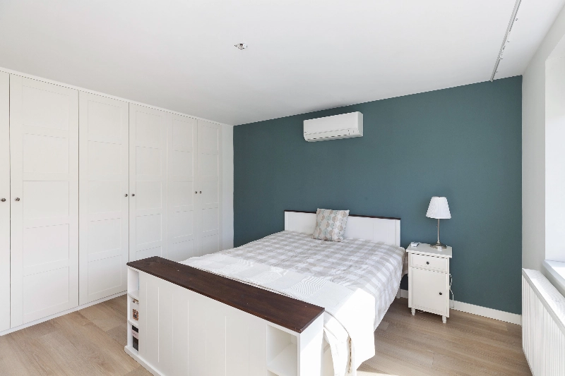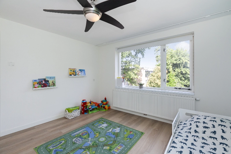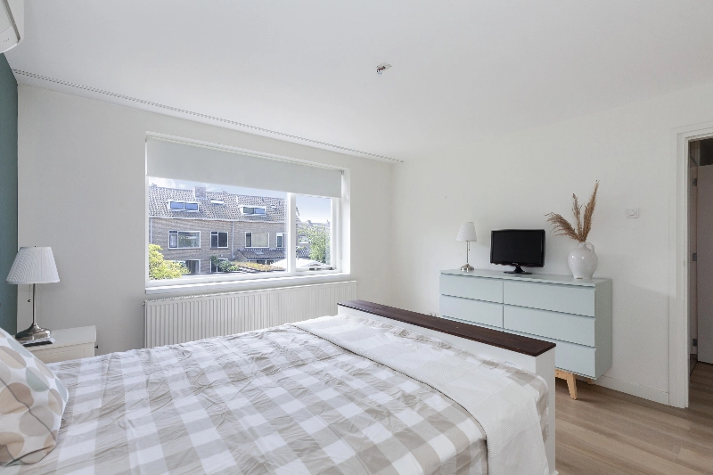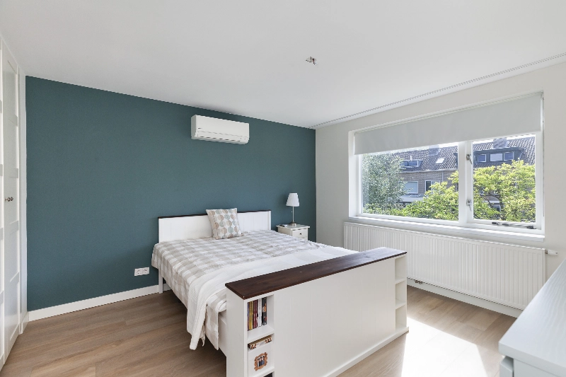 Aan de achterzijde van de woning vind je de grootste slaapkamer. Deze is strak gestukt en is voorzien van airconditioning.
