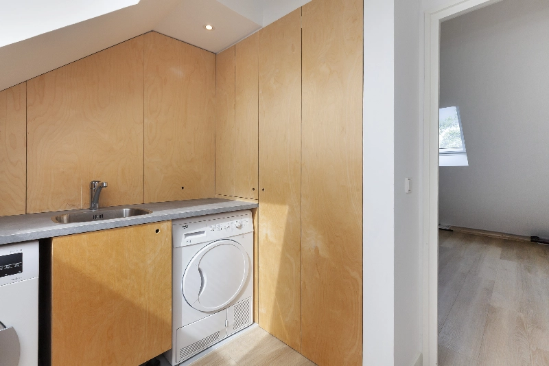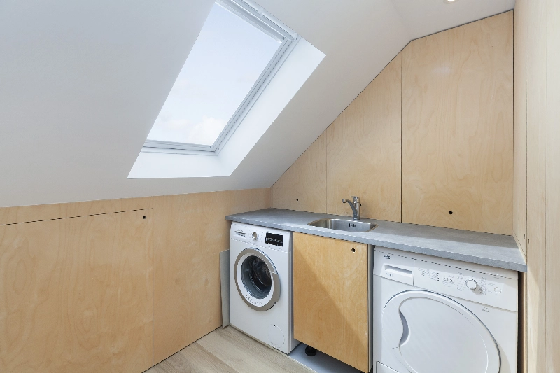 Via de nieuw geplaatst trap kom je op de zolderverdieping, waar je binnenkomt op de voorzolder met groot dakraam. Hier is ook de wasruimte met aansluiting voor de wasmachine. De gehele verdieping is voorzien van een eikenlook pvc-vloer.