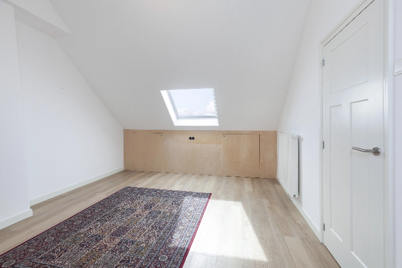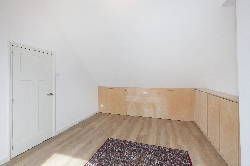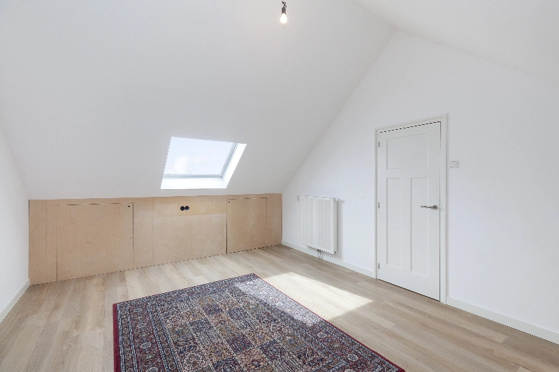 De ruime zolderkamer heeft handige bergruimte achter knieschotten en is perfect als extra slaapkamer, hobbyruimte of werkplek.