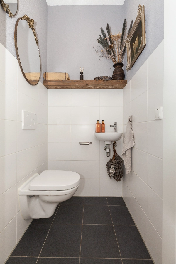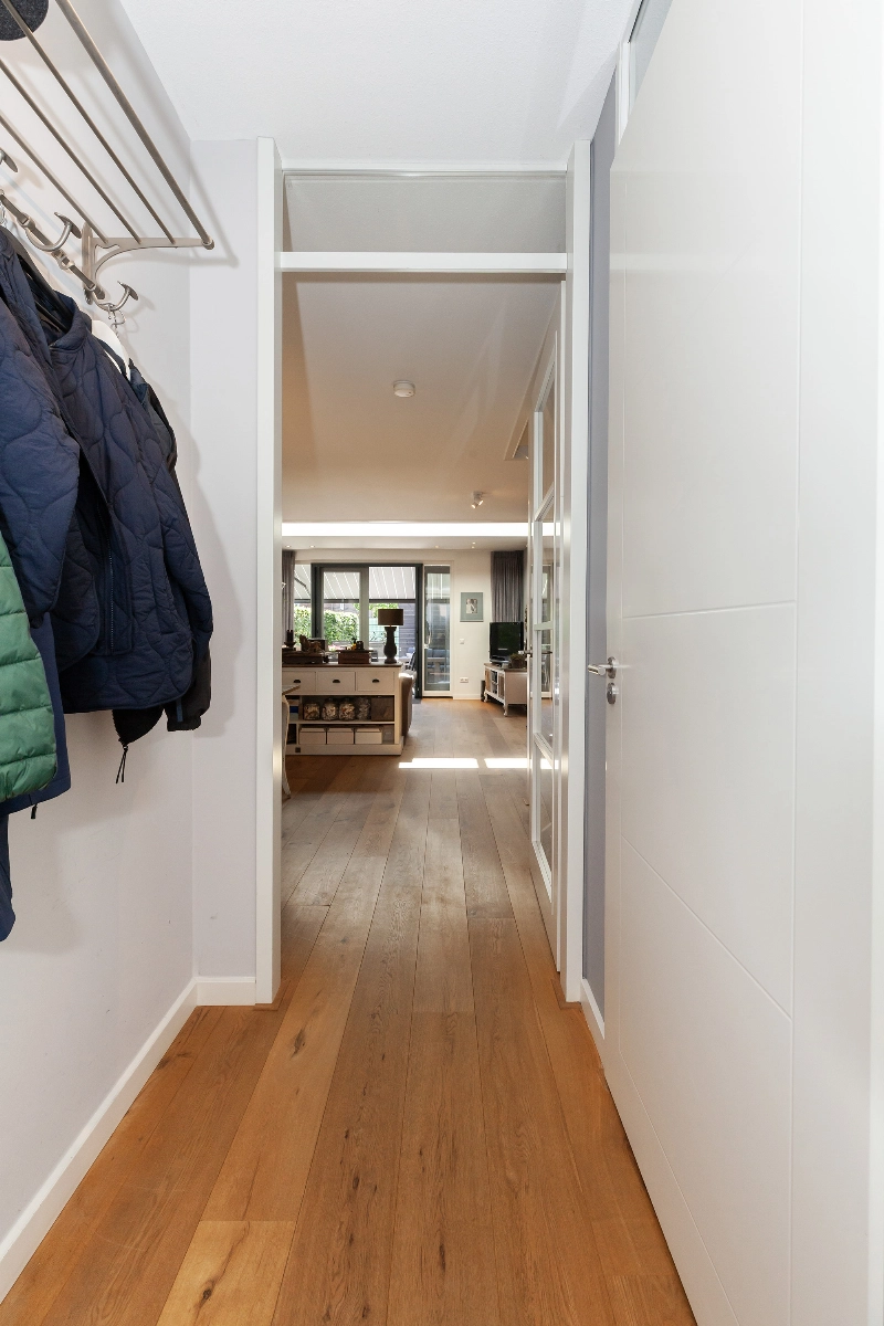 Via de verzorgde voortuin bereik je de fraaie voordeur. Entree, gang met meterkast en gedeeltelijk betegelde toiletruimte met zwevend closet en fontein. De eikenhouten vloerdelen lopen door naar de woonkamer en keuken.