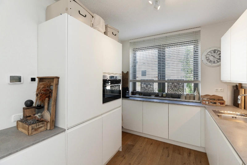We gaan weer naar binnen en lopen naar de voorzijde. Hier vind je de keuken in een U-opstelling met mat witte fronten, kunststof werkblad en alle inbouwapparatuur zoals gaskookplaat, afzuigkap( naar buiten), vaatwasser en oven zijn aanwezig en in de hoge opstelling vind je de koelkast en vriezer.