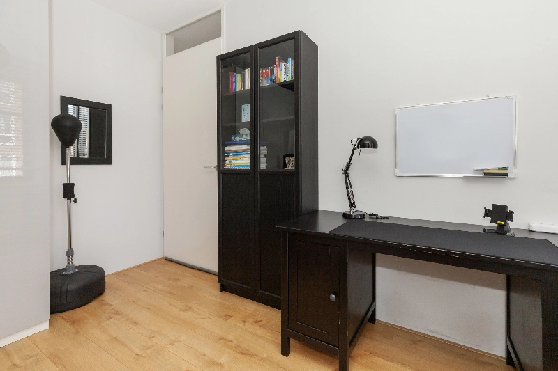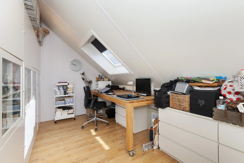 Deze grote zolderverdieping is opgesplitst in 2 aparte kamers. De kamer aan de achterzijde is thans in gebruik als werkkamer maar kan natuurlijk prima dienen als inloopkamer behorende bij de masterbedroom. Deze achterkamer is voorzien van een dakraam en wordt afgesloten door middel van een schuifdeur.
