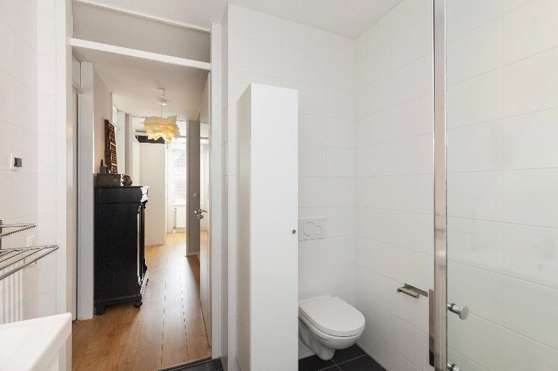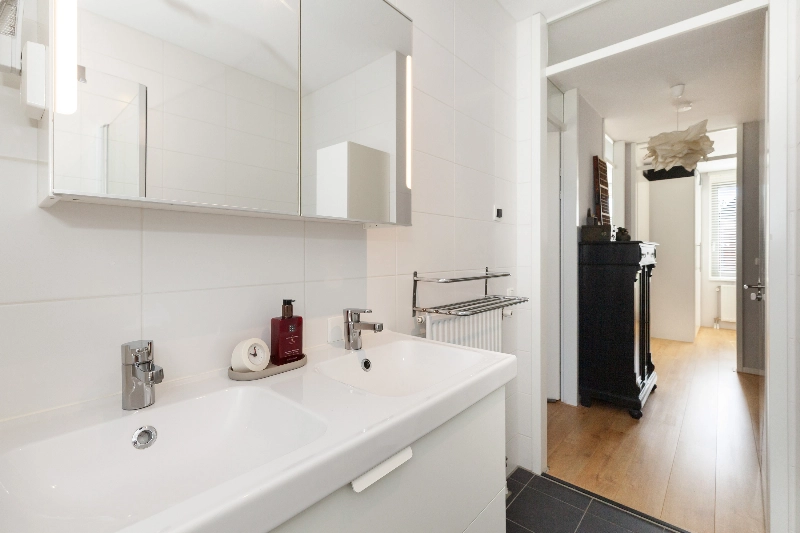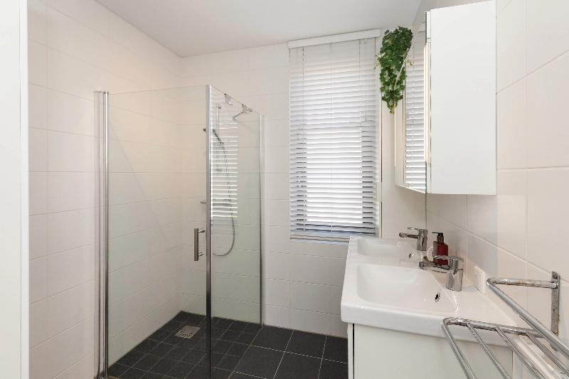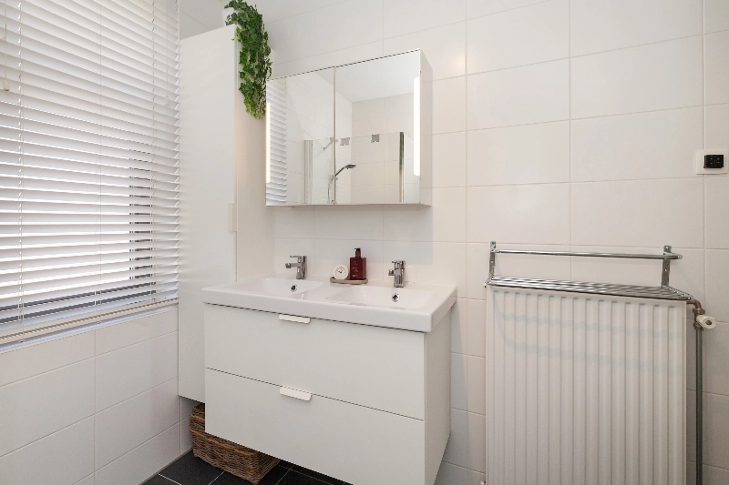 De geheel modern betegelde badkamer heeft daglicht en is uitgevoerd met een douchehoek, 2e toilet, dubbel wastafelmeubel, radiator en afzuiging.