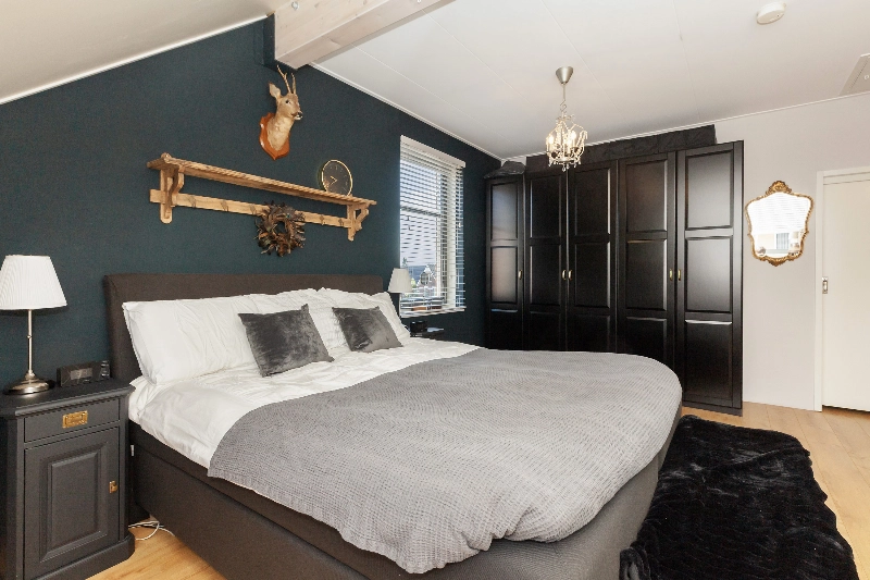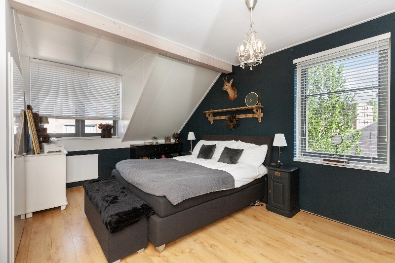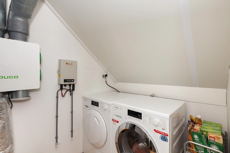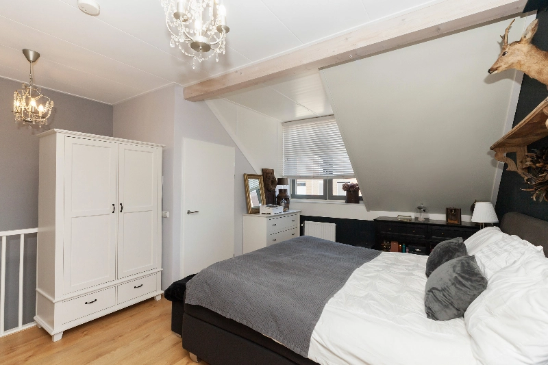 De grote zolderkamer is nu in gebruik als ouderslaapkamer en is voorzien van een dakkapel aan de voorzijde en heeft ook hier weer een zijraam. Onder de extra hoge kap is een vliering gerealiseerd, bereikbaar via een vlizotrap. Vanuit deze slaapkamer bereik je de aparte stook-wasruimte. Hier vind je de opstelplaats voor de CV- wasmachine, droger, omvormer van de zonnepanelen en de mechanische ventilatie.