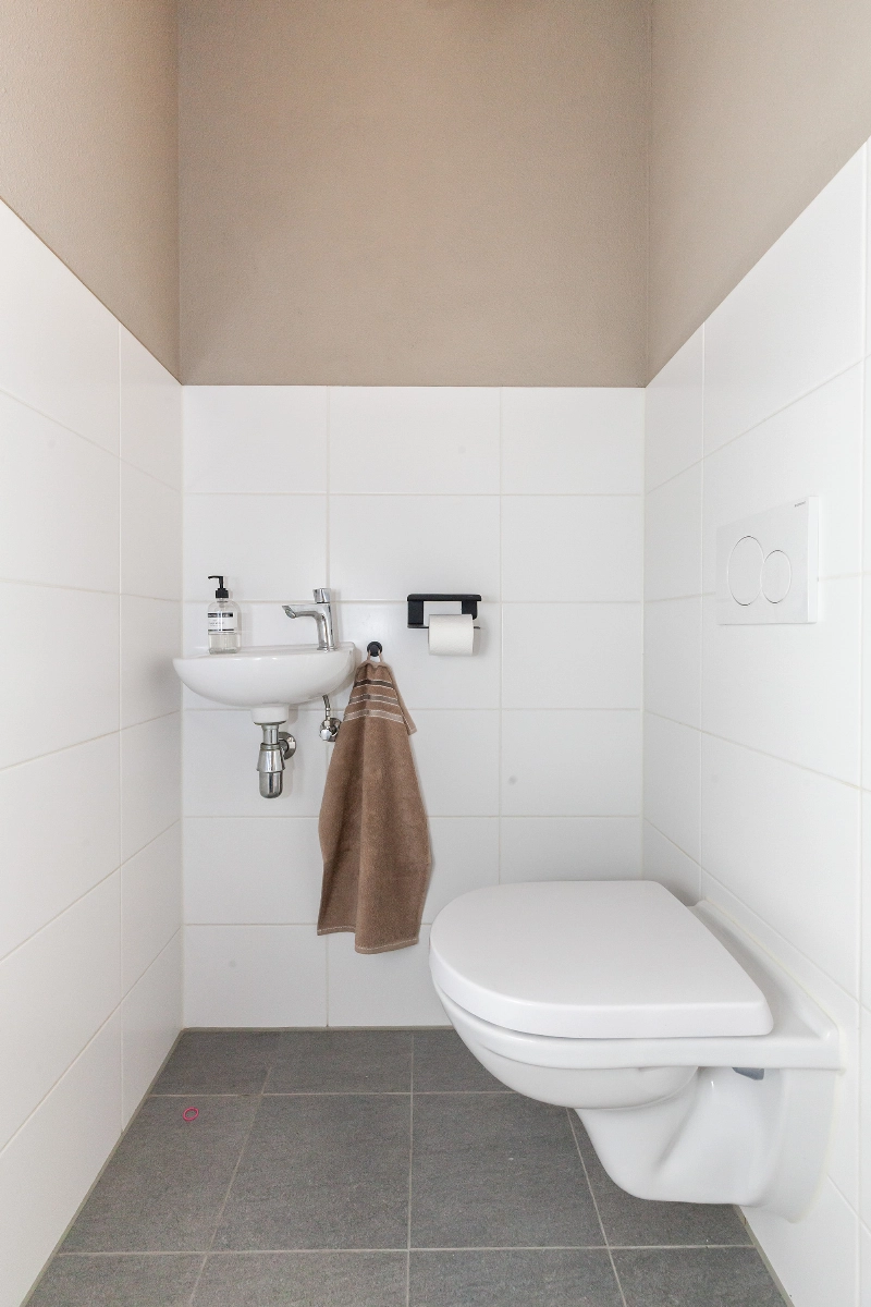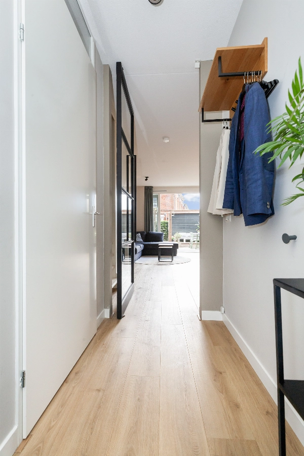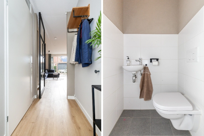 Entree via de keurig aangelegde voortuin. Mooie voordeur met brievenbus. Gang met uitgebreide meterkast en een gedeeltelijk betegeld toilet voorzien van witte wand- en antracietkleurige vloertegels, een zwevend closet en een fontein. Prachtige stalen tussendeur naar de woonkamer.