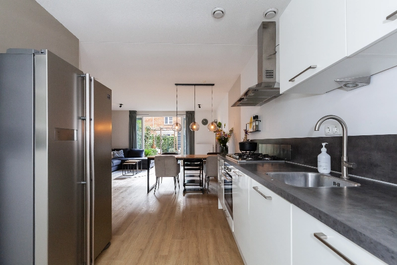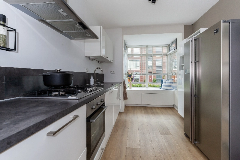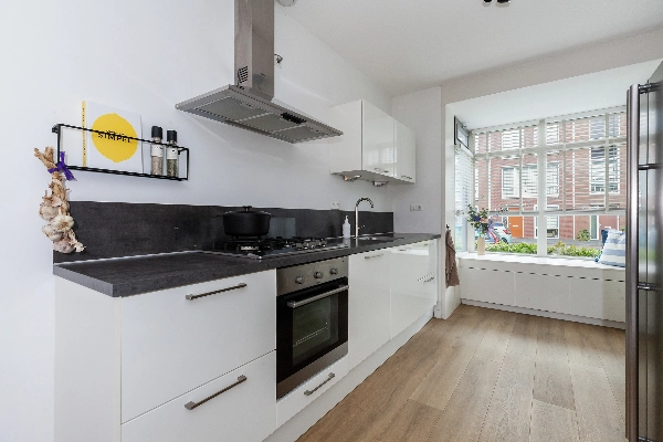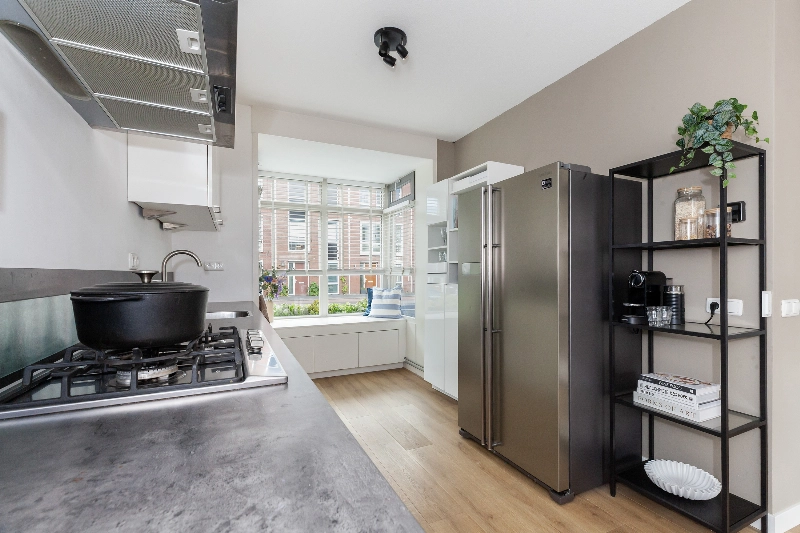 Aan de voorkant ligt de ruime, open keuken. Deze is compleet van opzet en voorzien van een strakke, witte hoogglans opstelling met afzuigkap, 5-pits gaskookplaat, oven, vaatwasser en veel bergruimte. De losse koel-vriescombinatie blijft achter. En dan die erker! Hier is een kleine sfeervolle zithoek gemaakt voorzien van 3 laden en een ingebouwde verwarmingsradiator. Hier kunnen kinderen leuk spelen of je leest hier zelf een boek met leuk zicht op de straat.