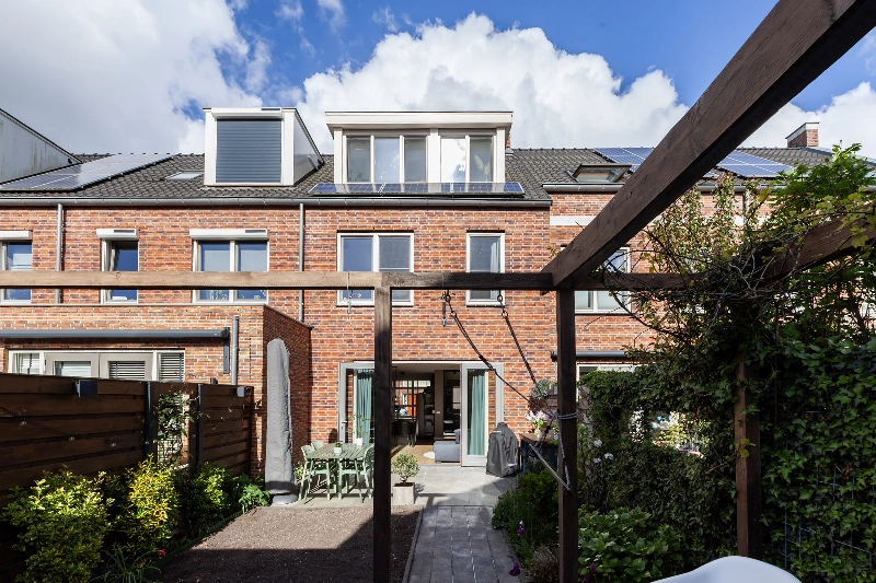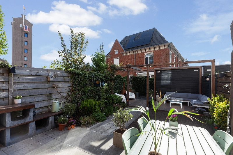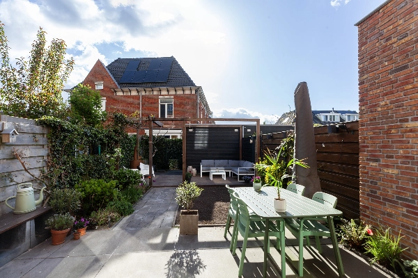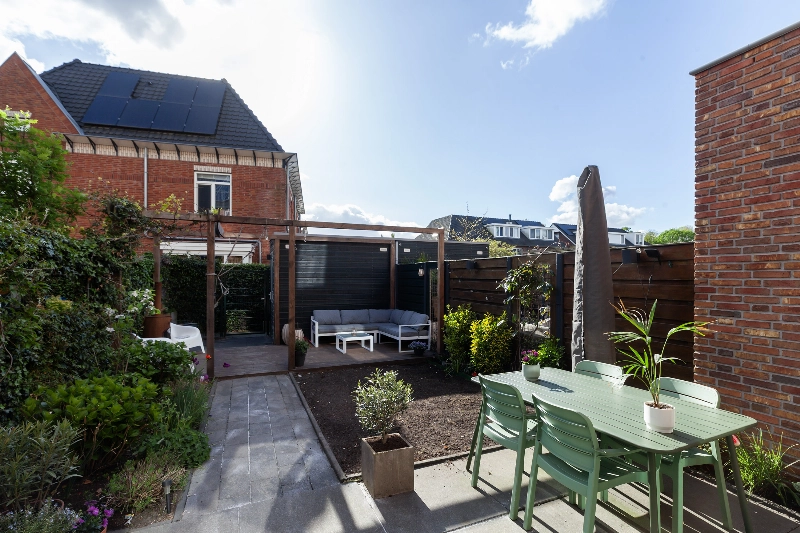 De diepe tuin is op het Oosten gelegen en is netjes bestraat en voorzien van een waterkraan. Groen en bestrating wisselen hier af en de pergola bij de houten berging geeft veel sfeer. Wat een fijne tuin waar je overdag rustig van de zon kunt genieten! De houten berging geeft plaats aan de fietsen terwijl op het achtergelegen mandelige terrein een eigen parkeerplaats bij de woning behoort. Deze bereik je via de achterom in de tuin.