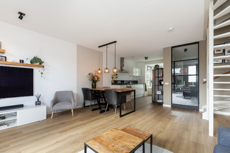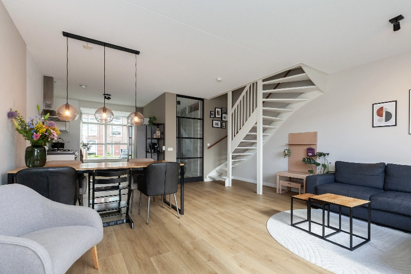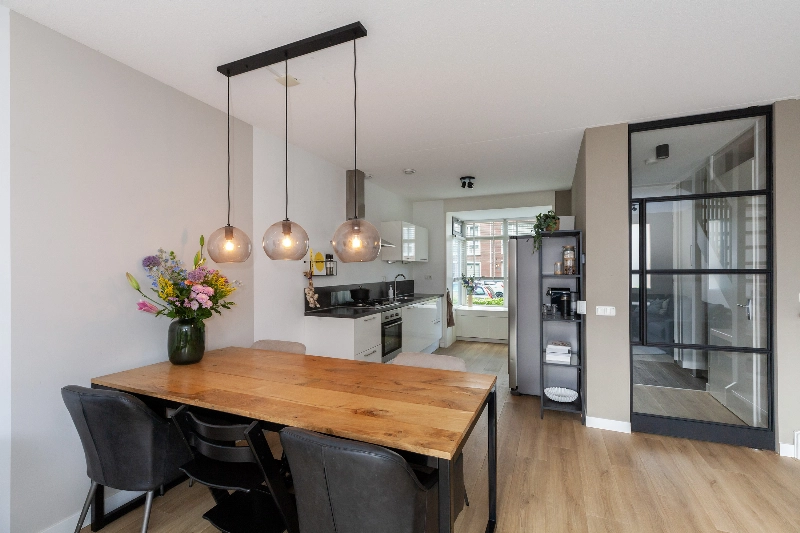 De woonkamer is een fijne, licht kamer met strak afgewerkte wanden en een houtlook laminaatvloer. De keuken is modern afgewerkt en heeft in de erker aan de voorzijde een leuk zithoekje. Geniet in de middag van de sfeervolle lichtinval in deze erker. Op de 1e verdieping vind je drie goed bemeten slaapkamers met ook hier weer een mooie laminaatvloer. De badkamer is modern en compleet afgewerkt.
