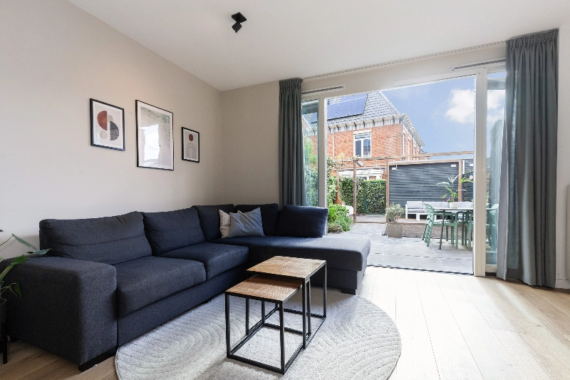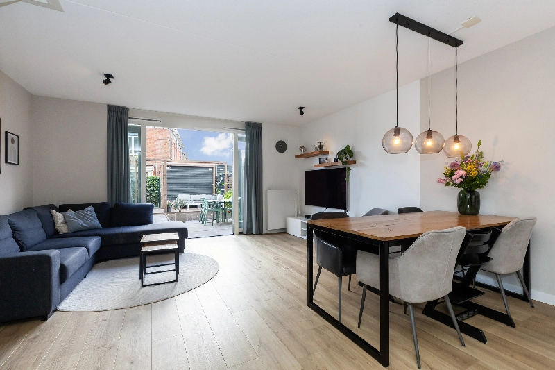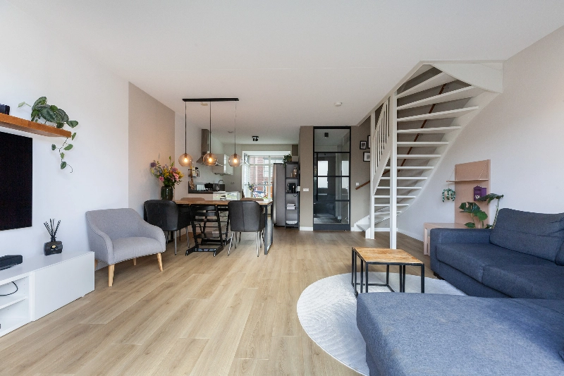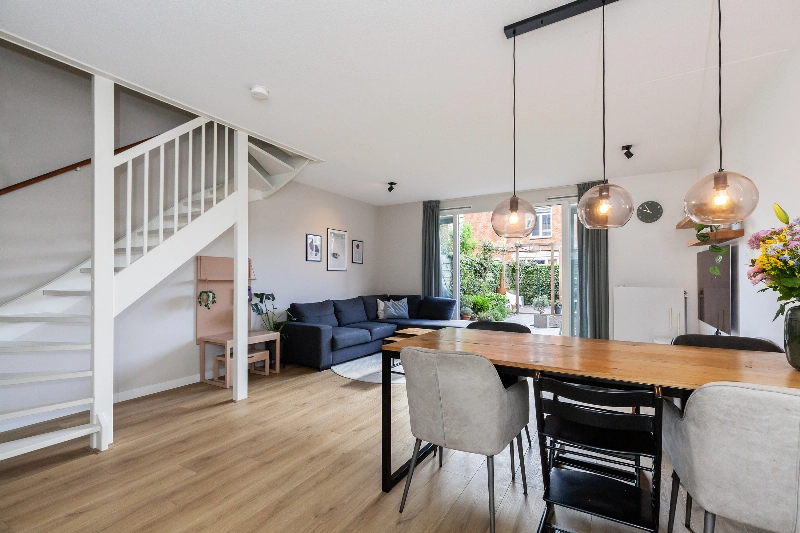De woonkamer is ruim van opzet en heeft een open trap naar de slaapverdieping. De dubbele openslaande deuren naar de diepe tuin geven veel sfeer. Evenals de erker aan de voorzijde! Vanuit hier is er een vrij zicht op de straat.