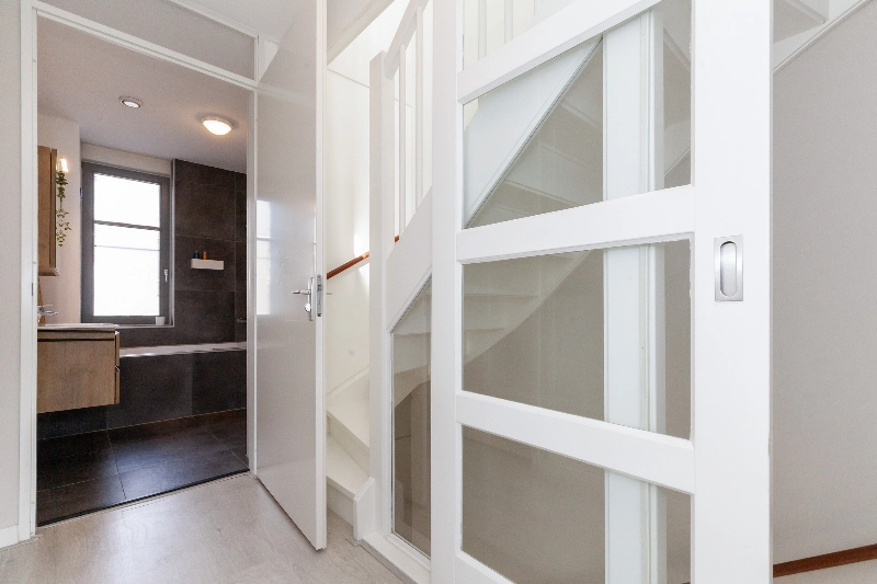 Via de trap bereik je de 1e verdieping. De schuifdeur geeft privacy tussen de woonkamer en de slaapverdieping.