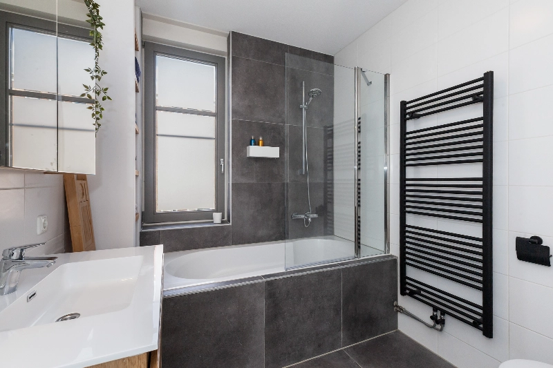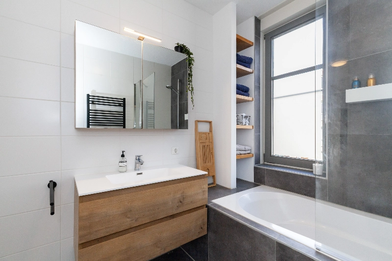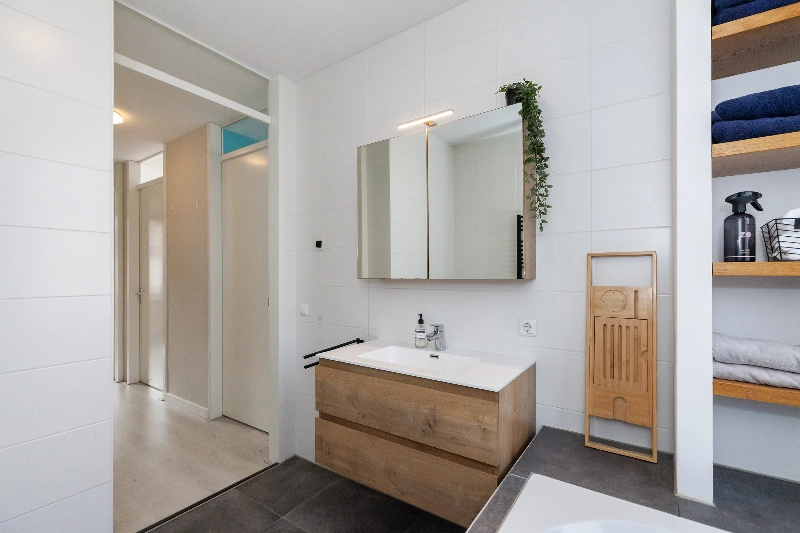 De moderne badkamer is geheel voorzien van witte- en antracietkleurige betegeling met een leuke nis voor de handdoeken en uitgevoerd met een eikenlook wastafelmeubel met spiegelkast, ligbad met douchescherm, een handdoekenradiator en een 2e toilet. Een raam zorgt voor daglicht.