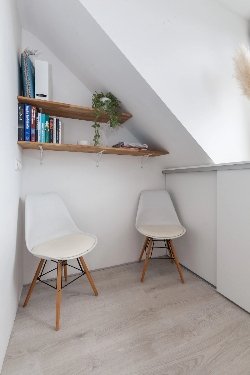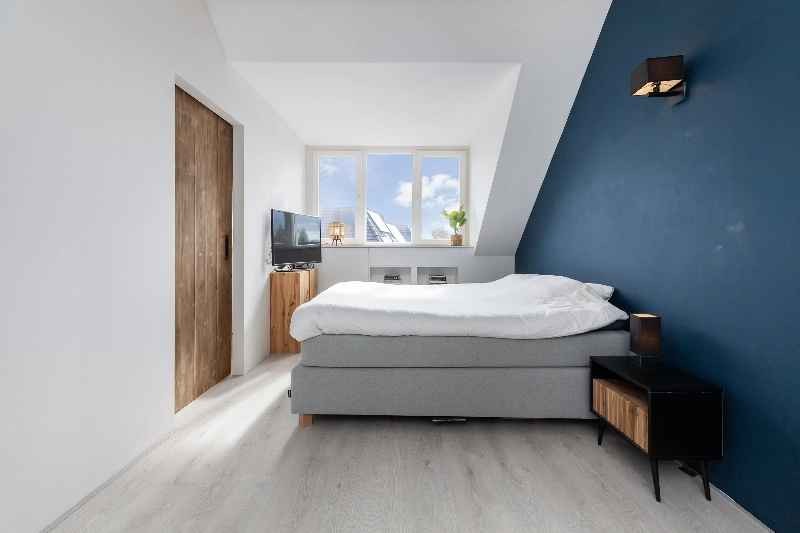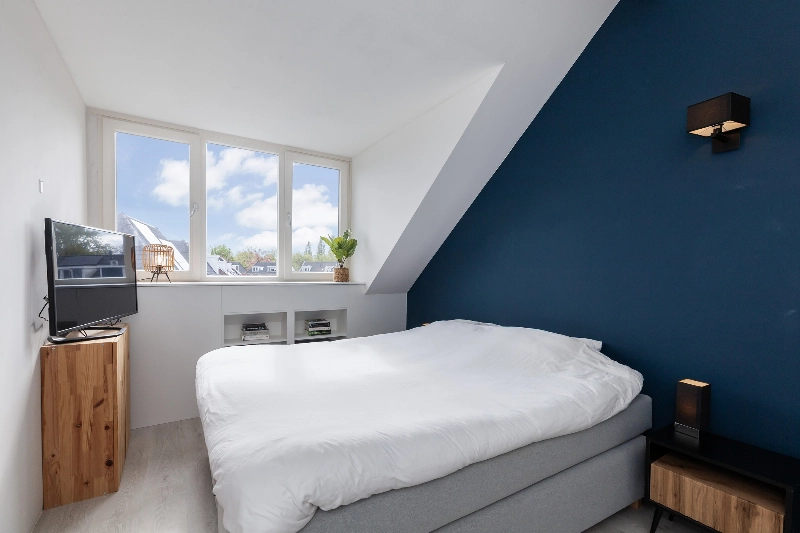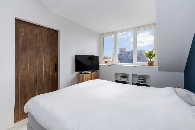 Via een mooie houten schuifdeur bereik je de zolderkamer. Wat een heerlijke kamer is dit! Deze kamer is door het dakkapel een grote kamer. De hoge nok zorgt voor een extra ruimtelijk gevoel en de mooie inbouwkasten met verlichting maken het geheel af.