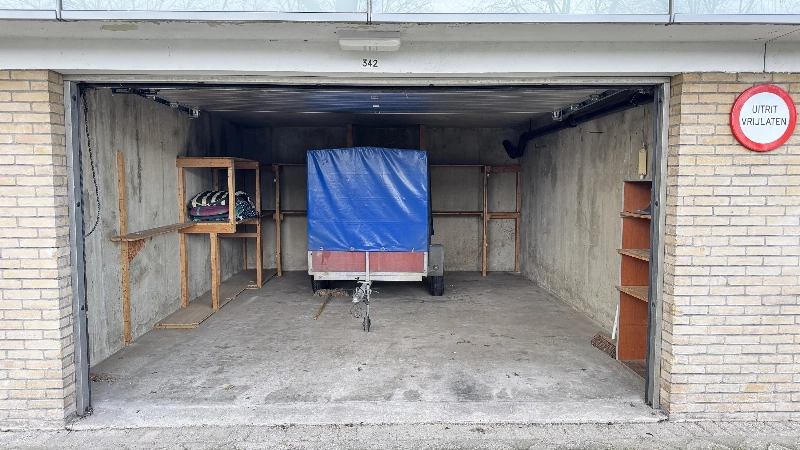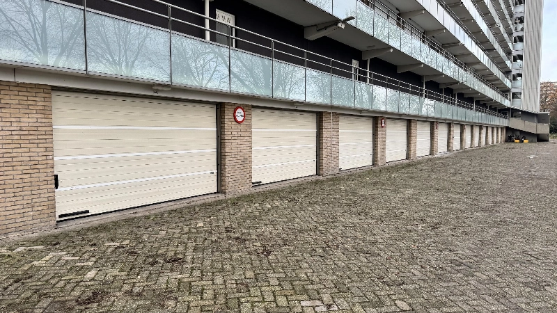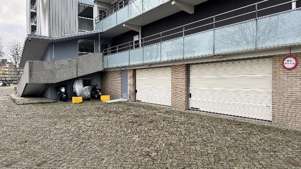 Ruime garagebox met ruimte voor twee auto's onder een goed onderhouden appartementen complex met een actieve VvE.