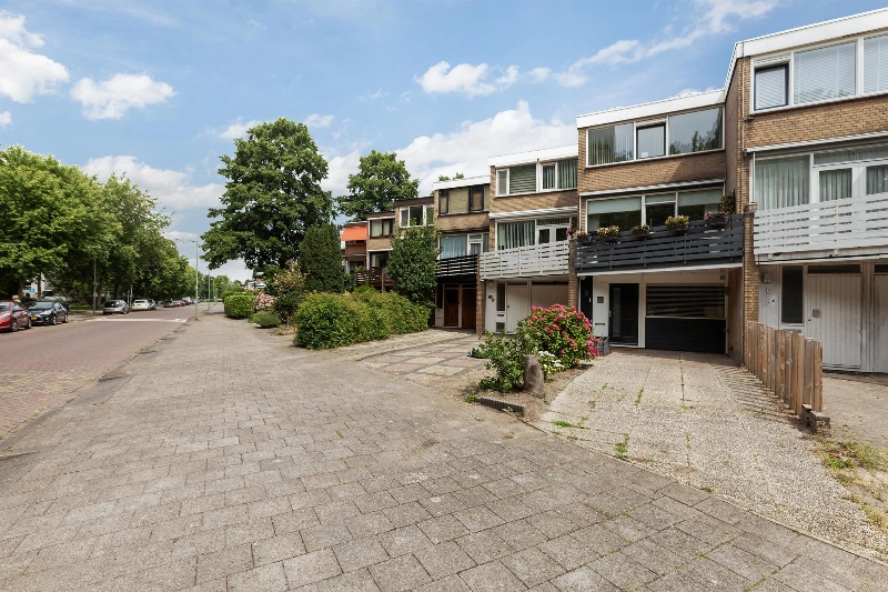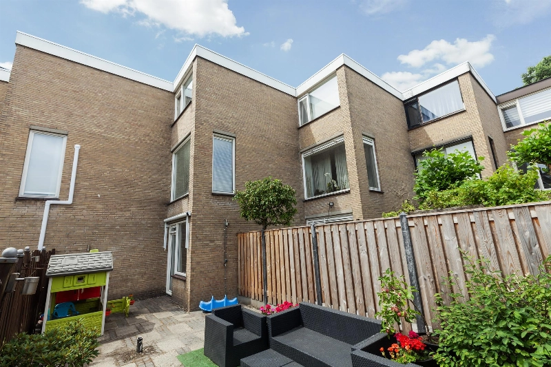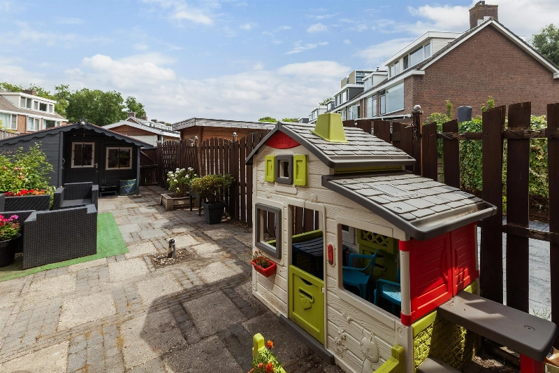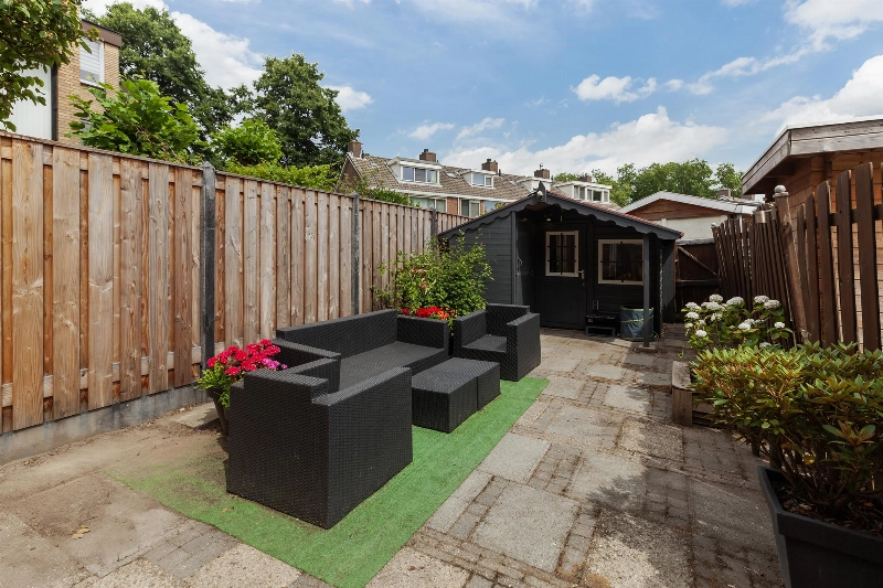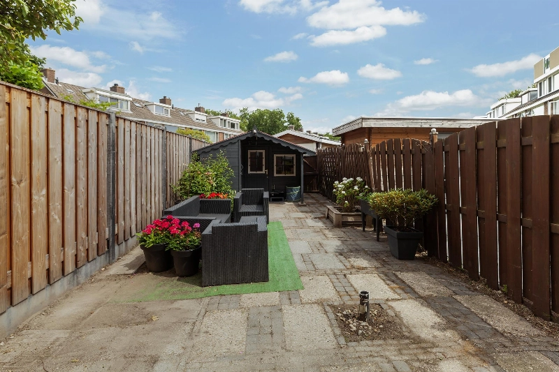 Aan de achterzijde vind je een diepe tuin met bestrating, zonnescherm, een houten berging en een achterom via de steeg.