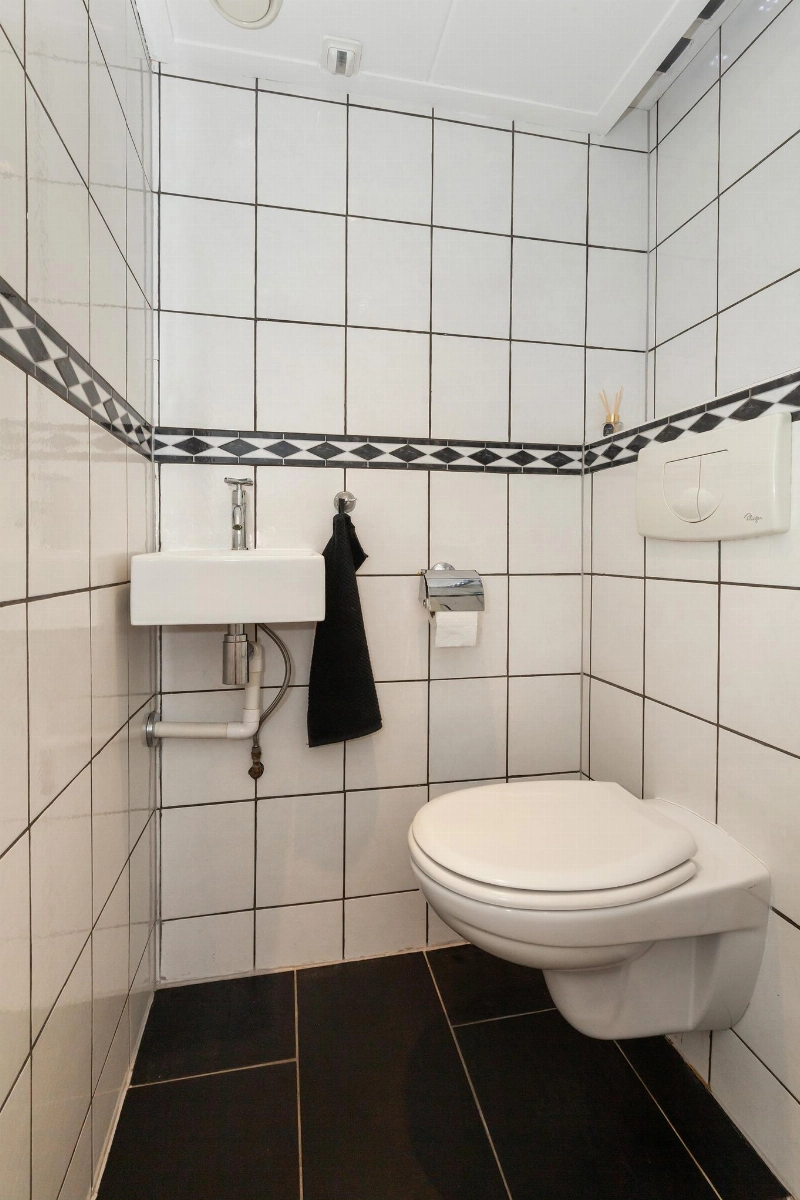 Moderne toiletruimte met zwart/witte betegeling, een zwevend toilet en een fonteintje.